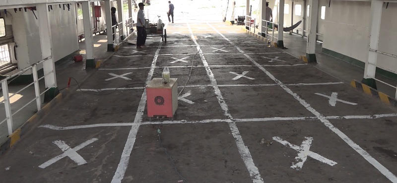 Bên cạnh đó, cho kẻ ô để đảm bảo vị trí đậu của các phương tiện cách nhau 2 mét, các phương tiện khi dừng chờ hoặc xuống phà phải đậu trên ô không có dấu X, ô có dấu X là khoảng trống không được đậu xe.