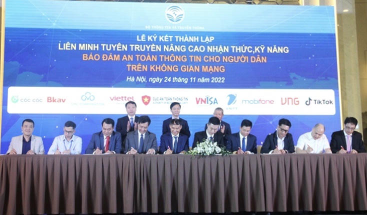 Nhằm mục tiêu nâng cao nhận thức, kỹ năng để bảo đảm giảm sự cố mất an toàn thông tin cho người dân trên không gian mạng, trong khuôn khổ Hội thảo - Triển lãm quốc tế Ngày An toàn thông tin Việt Nam 2022, Cục An toàn thông tin đã tổ chức Lễ ký kết thành lập Liên minh tuyên truyền nâng cao nhận thức, kỹ năng bảo đảm an toàn thông tin cho người dân trên không gian mạng (gọi tắt là Liên minh) cùng 7 đơn vị sáng lập, bao gồm: Viettel, VNPT, MobiFone, CMC, Bkav, VNG, Tiktok và Cốc Cốc.