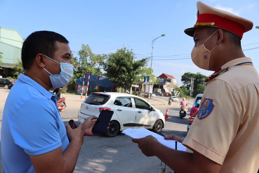 Lực lượng Cảnh sát giao thông kiểm tra giấy tờ theo quy định đối với các tài xế đến từ các tỉnh có dịch. |