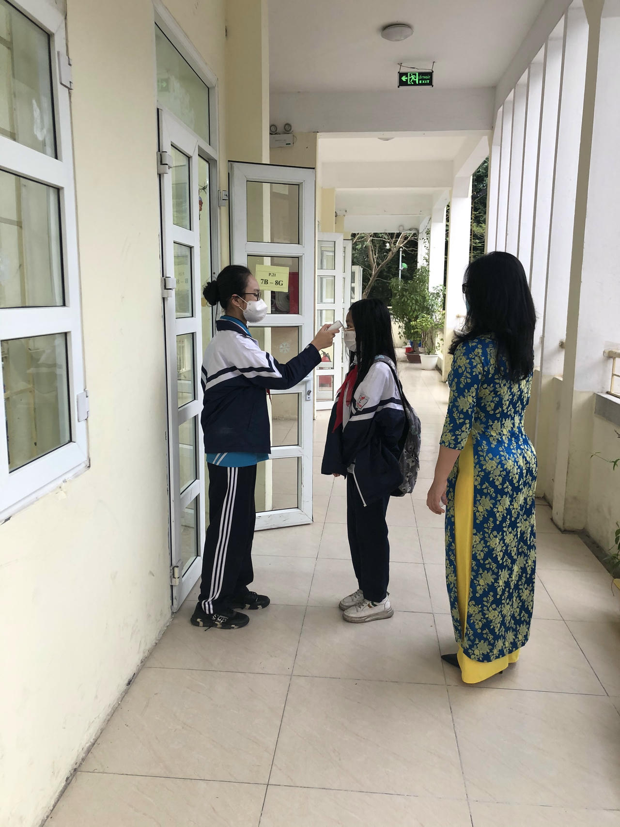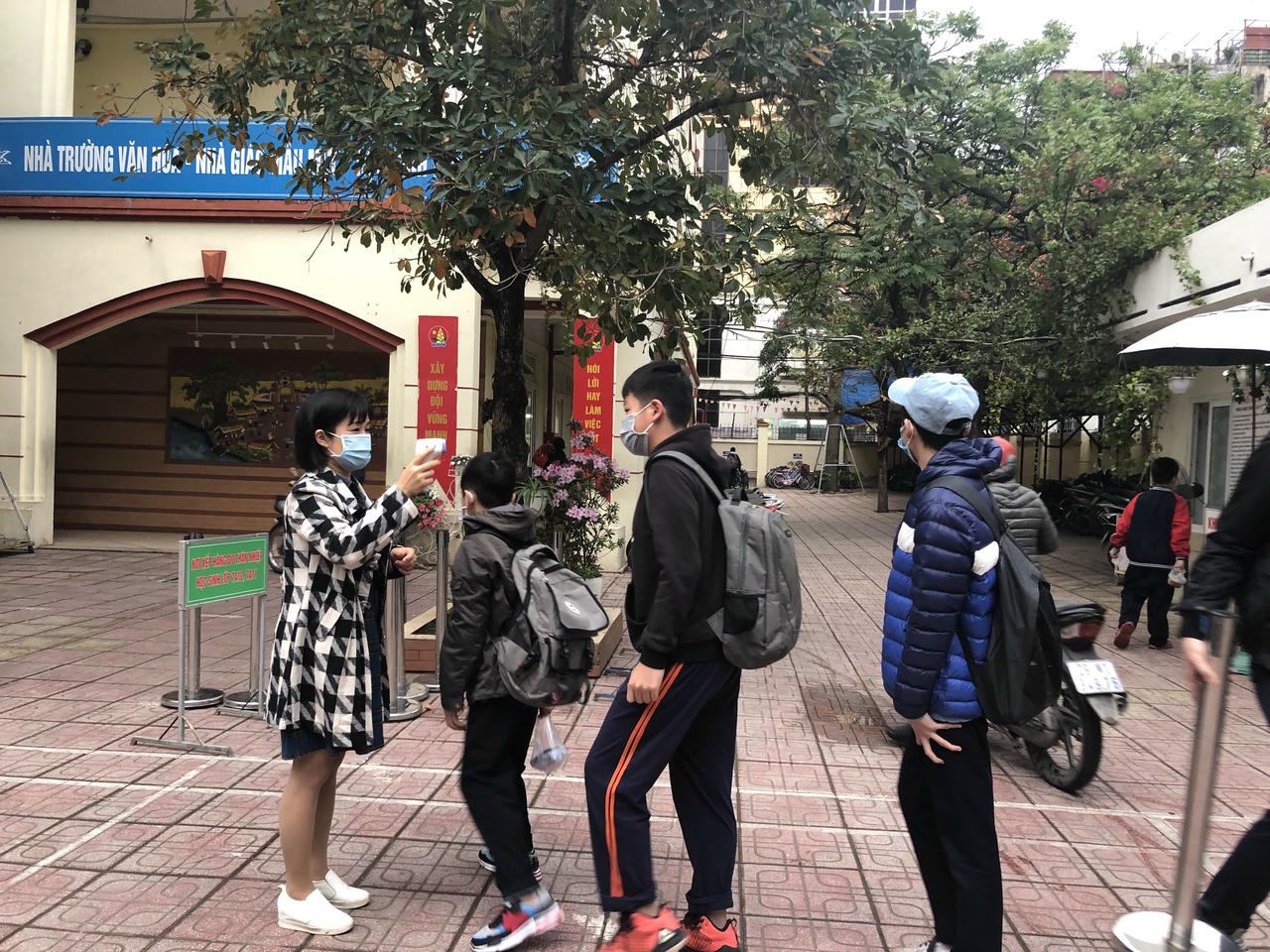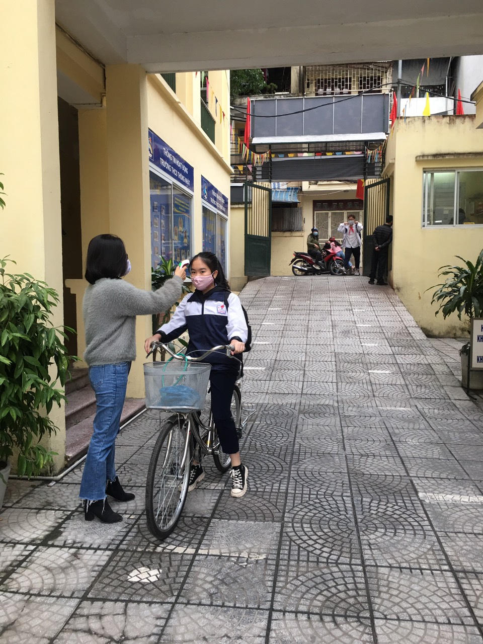 ...và đo nhiệt độ trước khi vào trường.