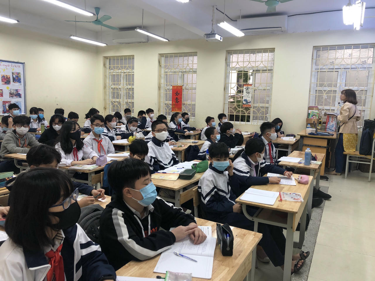 Học sinh chấp hành nghiêm quy định đeo khẩu trang trong lớp học.