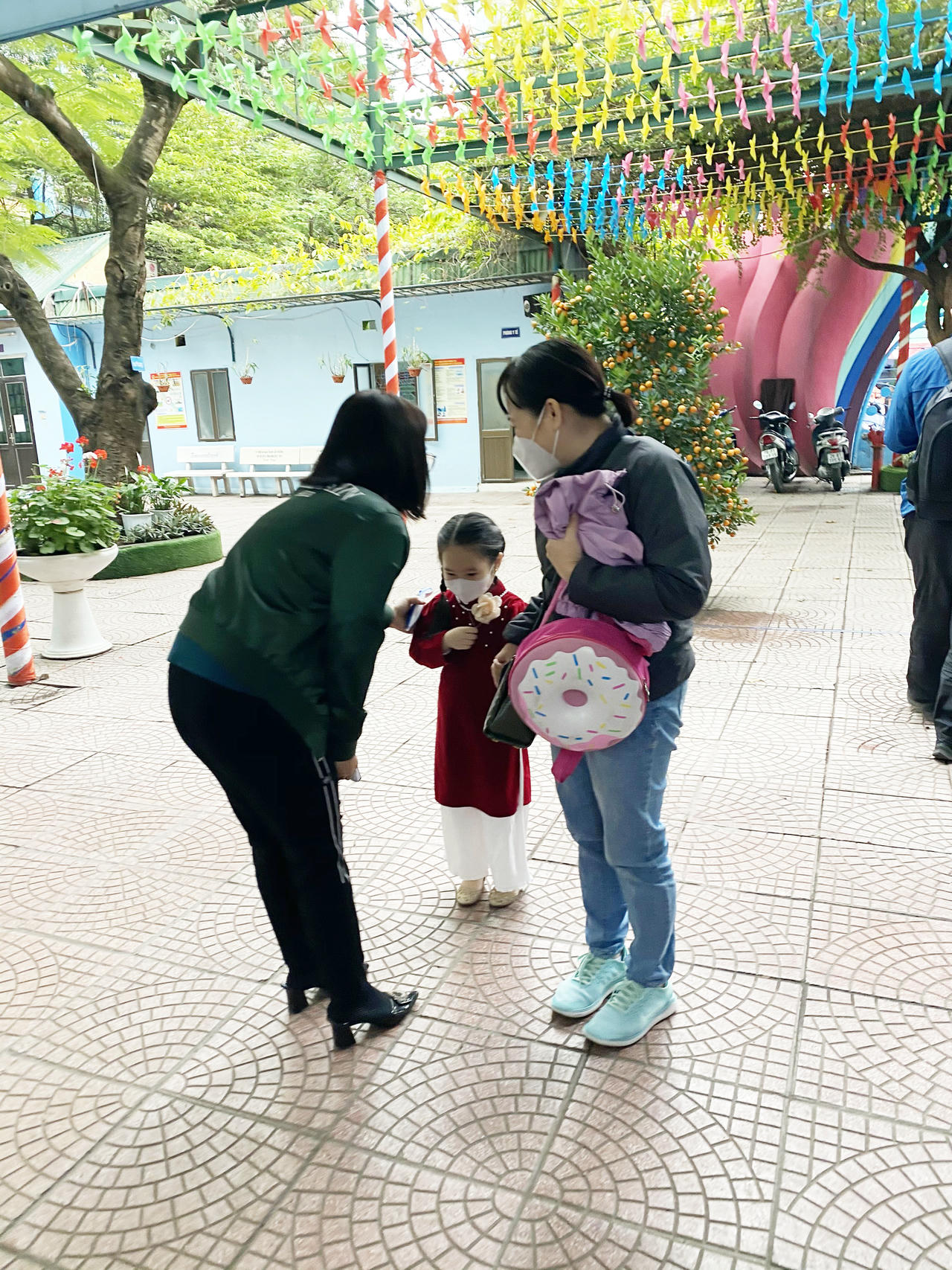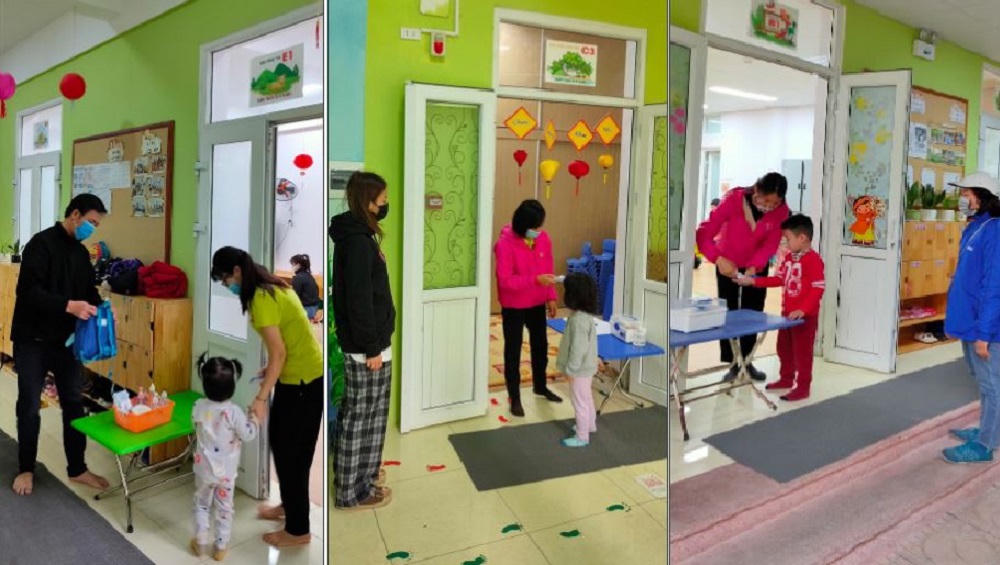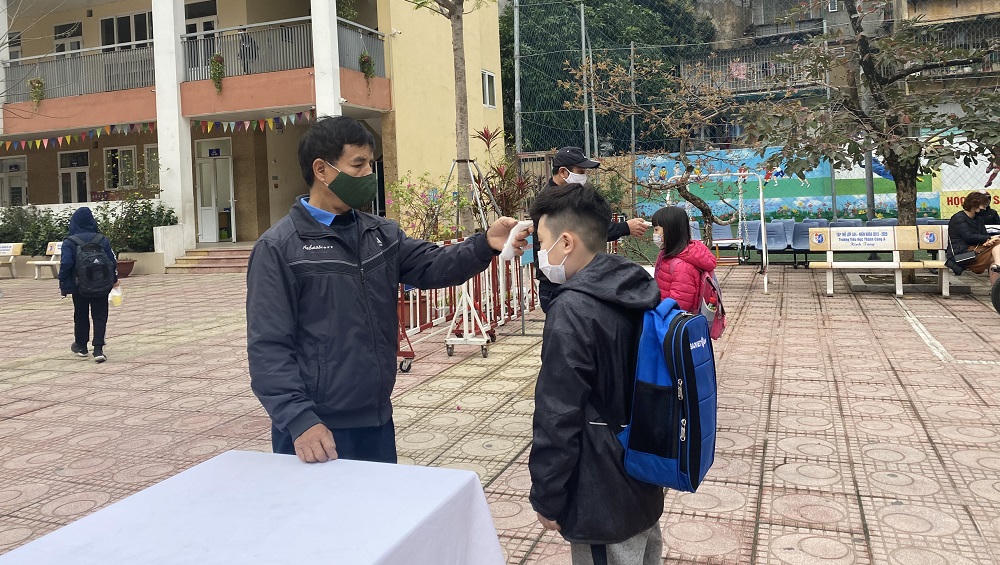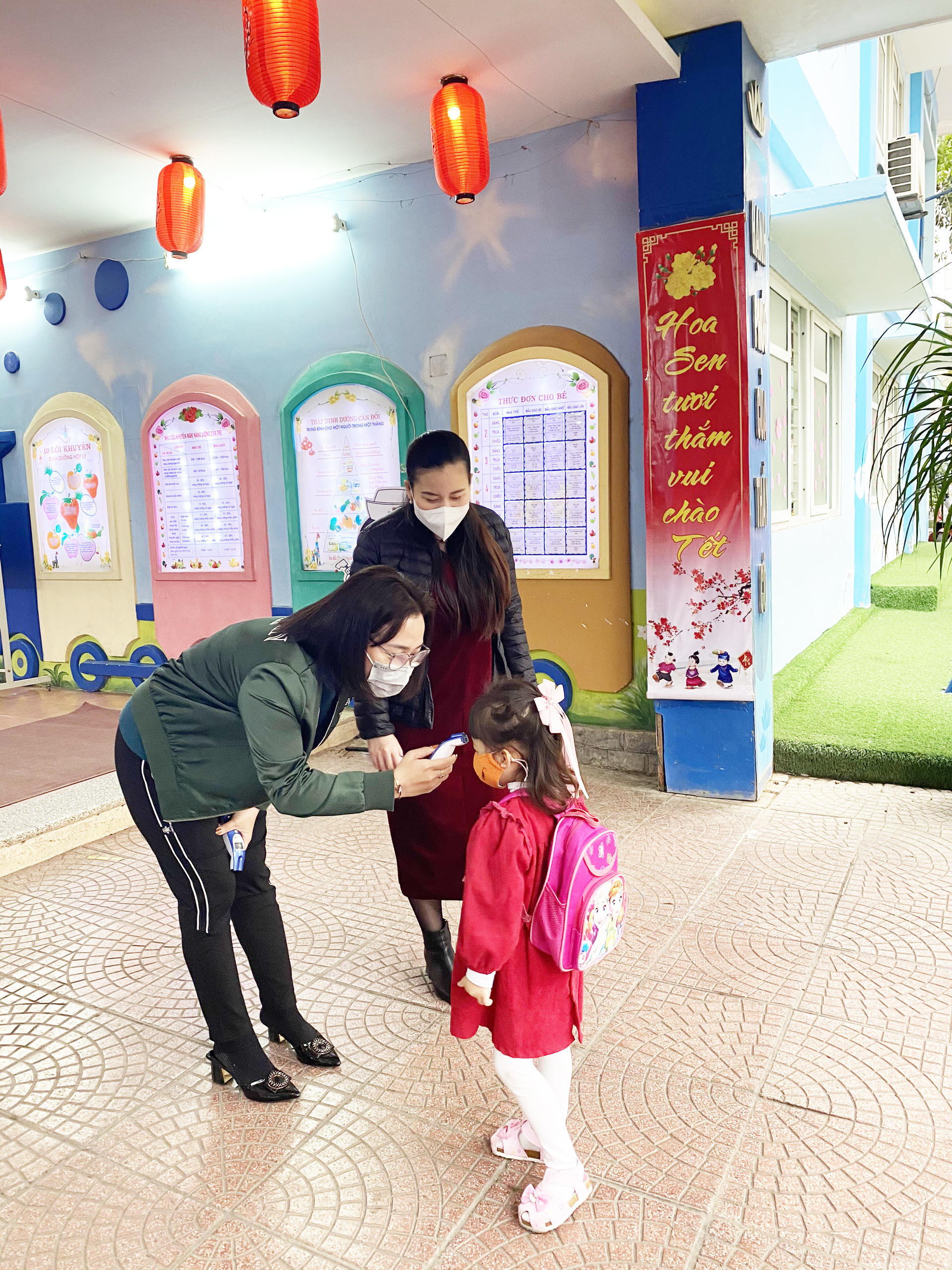 Các bé được cô giáo đo nhiệt độ trước khi vào lớp học.