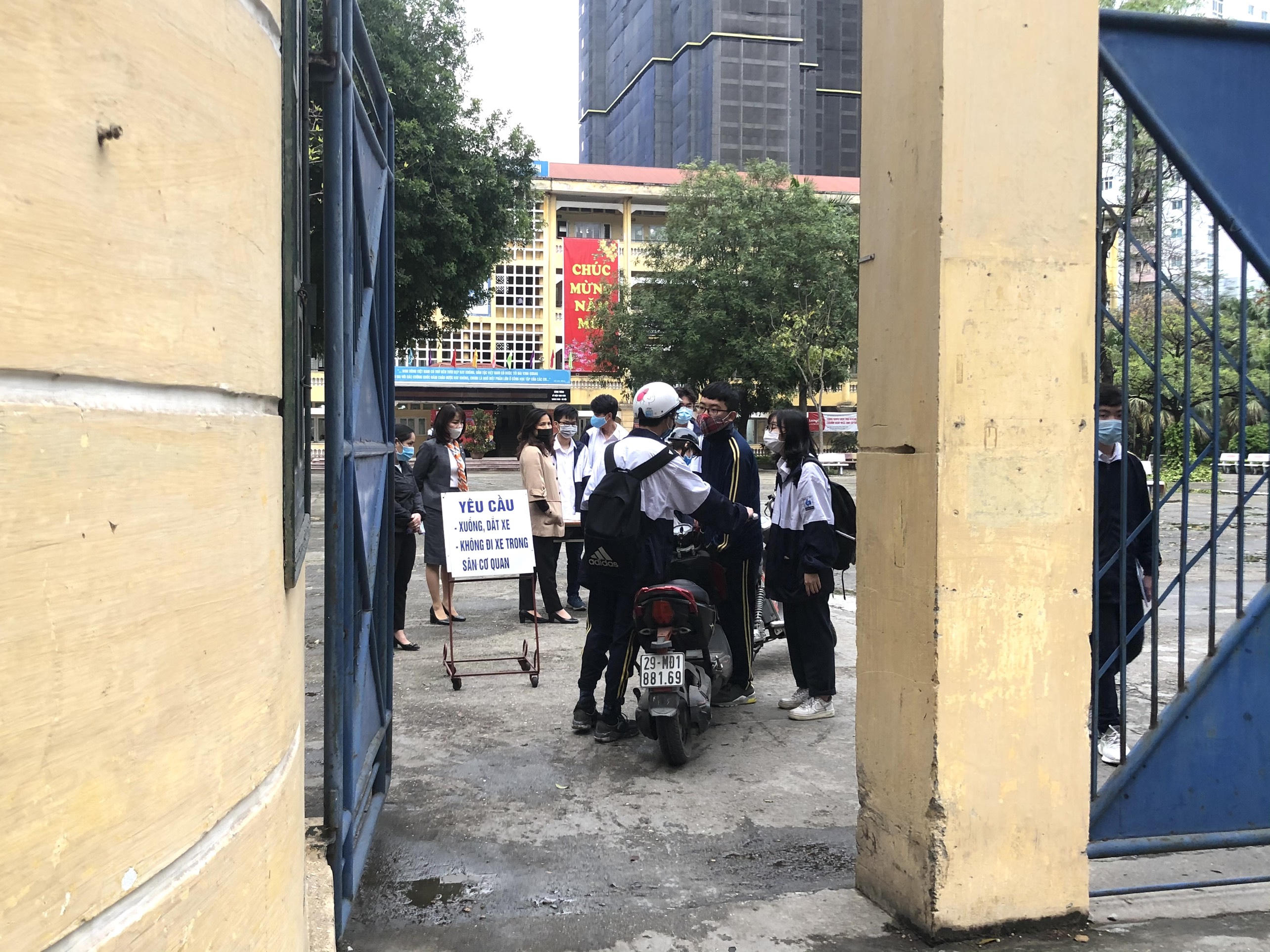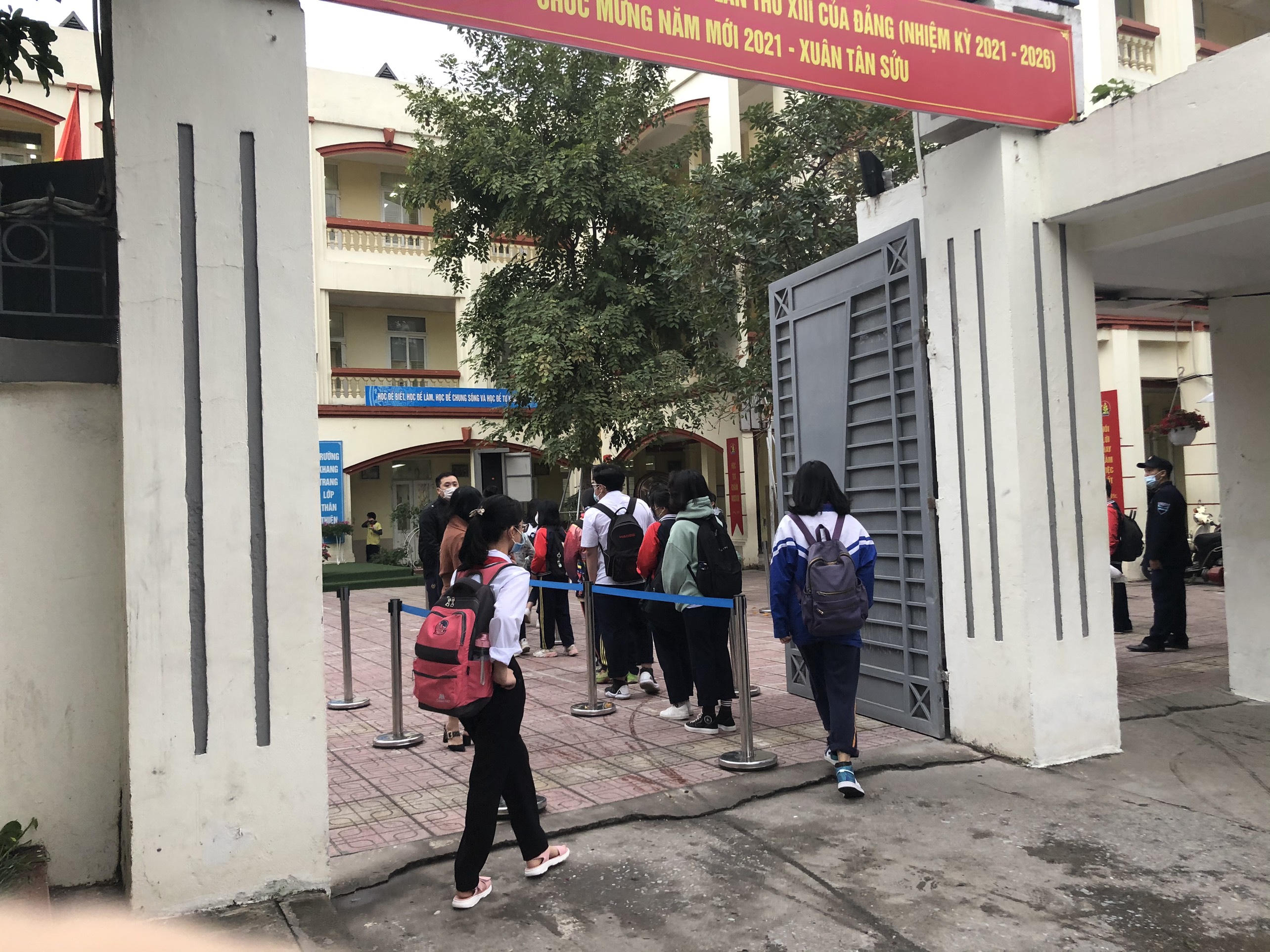 Ngày đầu con đi học trở lại sau thời gian dài nghỉ vì dịch bệnh, nhiều phụ huynh không giấu nổi lo lắng, dõi theo đến khi con vào lớp.