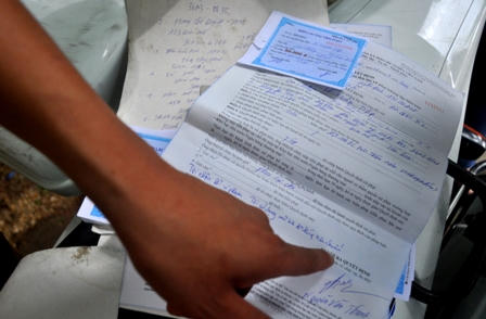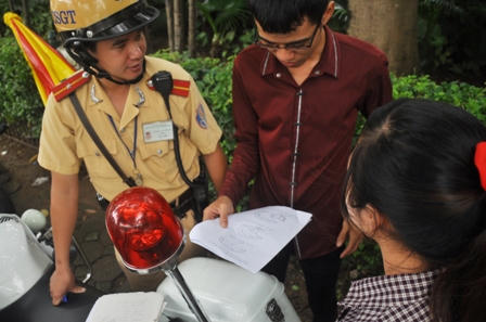 Các chiến sĩ CSGT còn cẩn thận đưa bản tuyên truyền hướng dẫn cho người dân đọc và chỉ dẫn để họ hiểu rõ hơn về việc đội MBH đạt chuẩn.