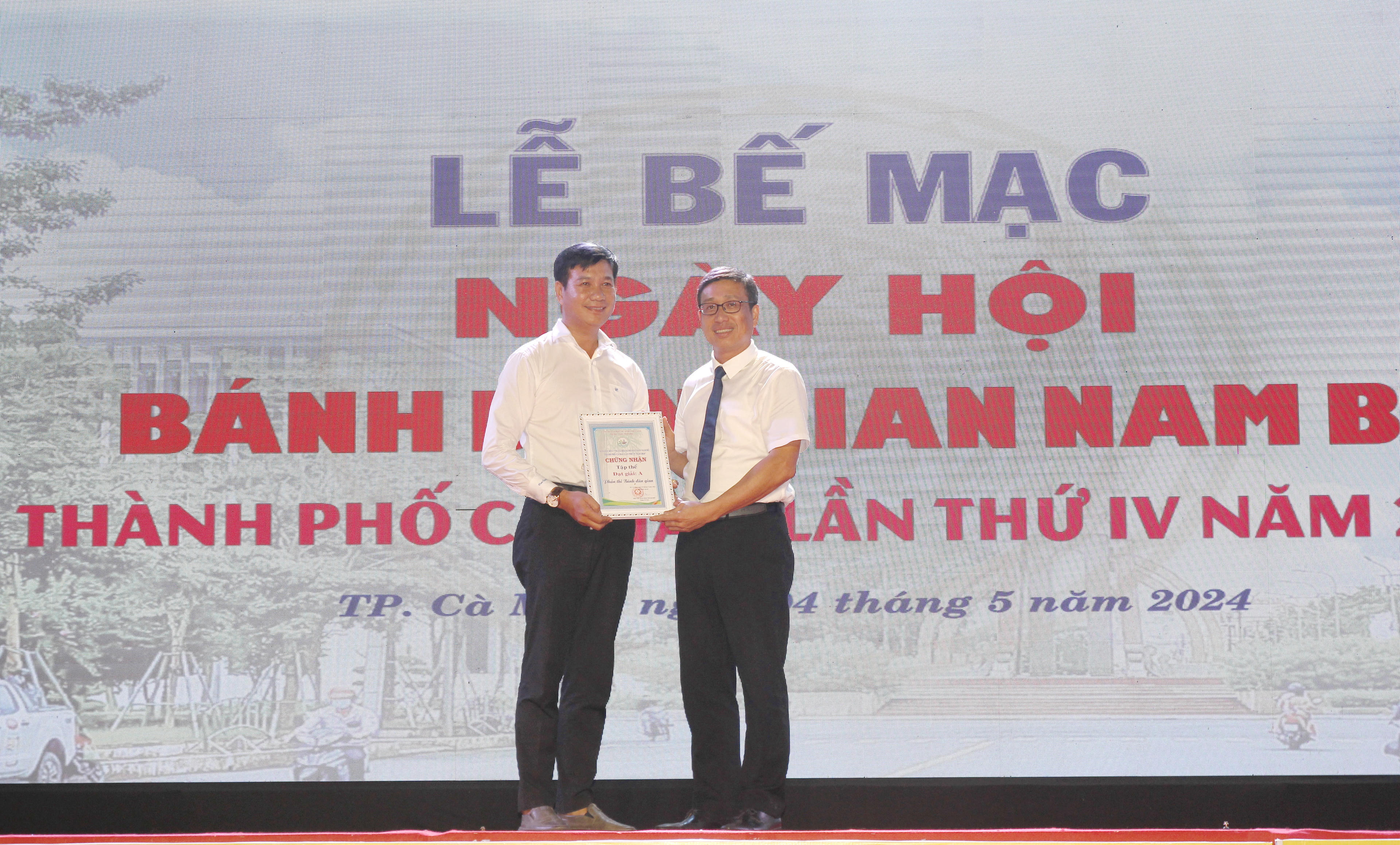 Ông Nguyễn Chí Công - Phó Giám đốc Sở Văn hóa, Thể thao và Du lịch tỉnh Cà Mau, trao giải Nhì hội thi trình diễn gói bánh tét thuộc về đơn vị huyện Ngọc Hiển và xã Hòa Tân (TP Cà Mau). |
