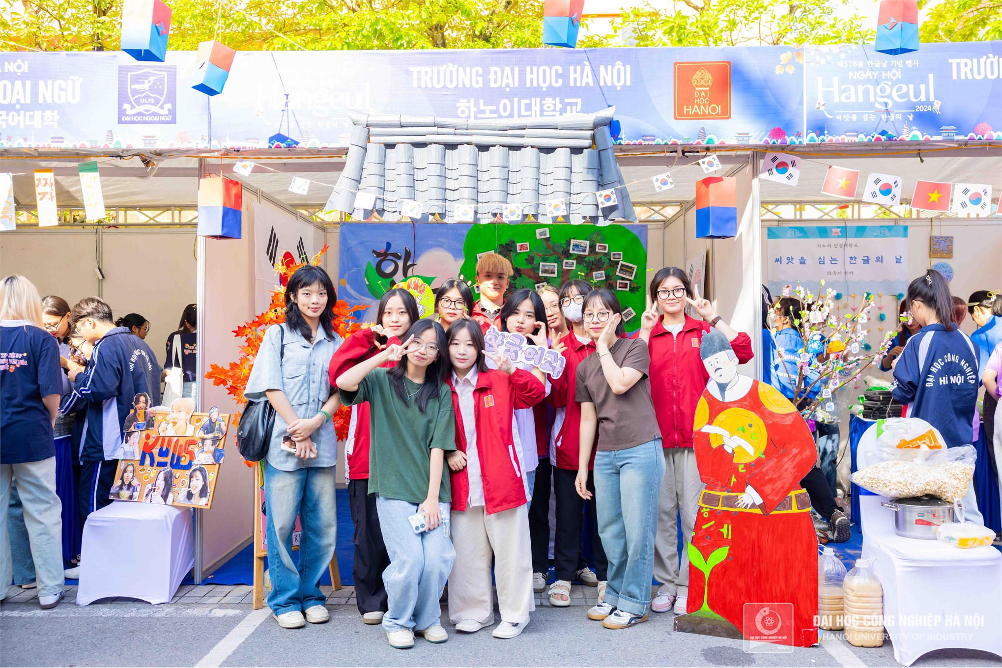 Khu vực gian trại trưng bày ẩm thực xứ Hàn của Đại học Công nghiệp Hà Nội được thiết kế màu sắc,sáng tạo, thu hút đông đảo sinh viên tới thăm quan