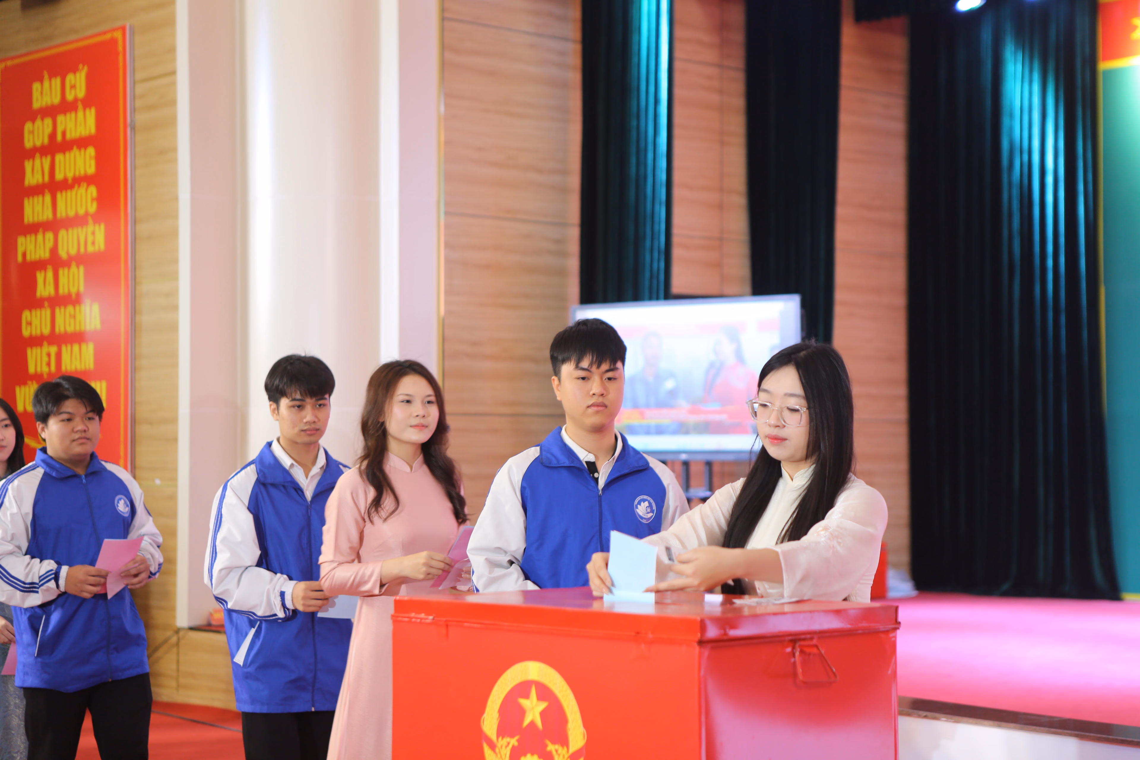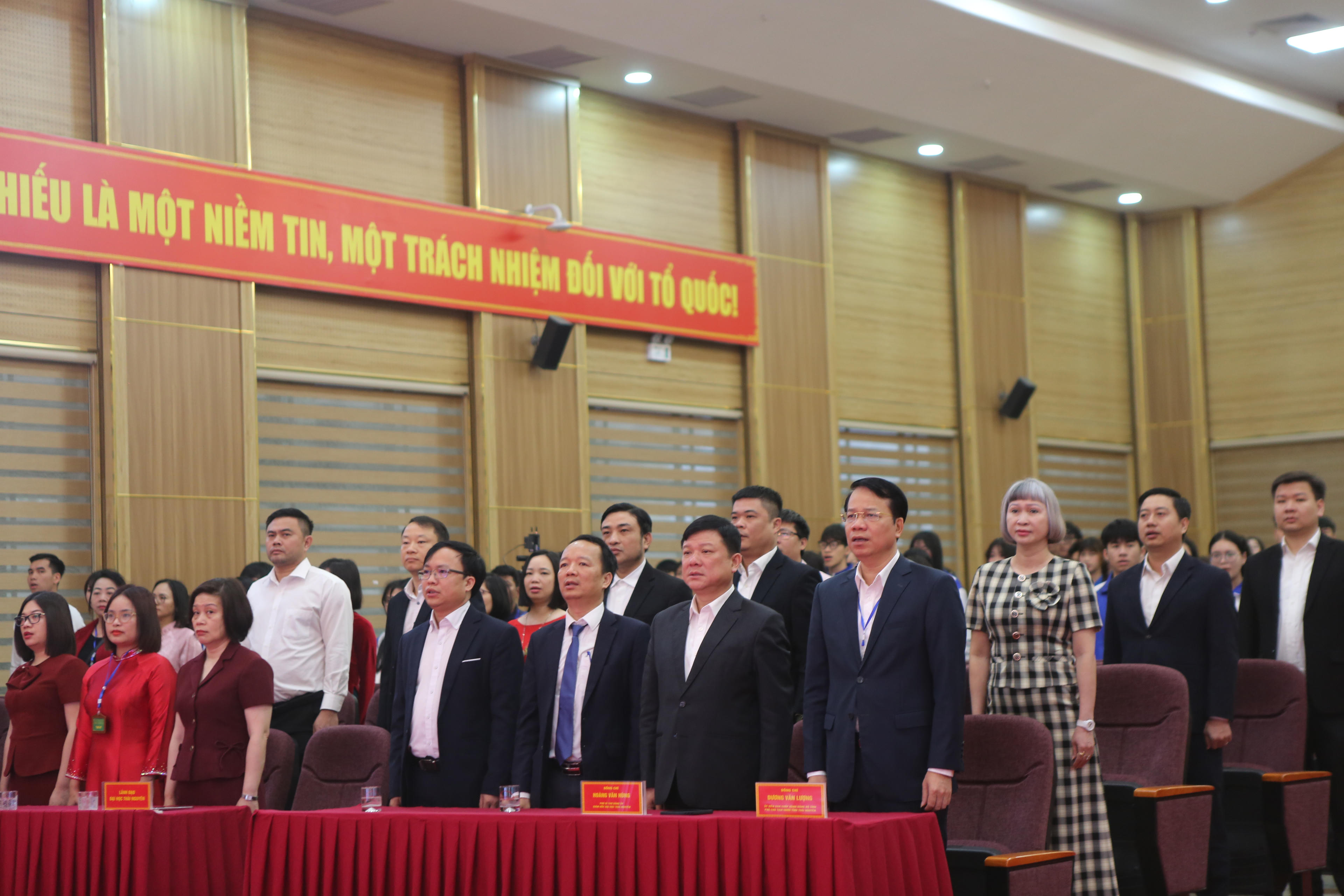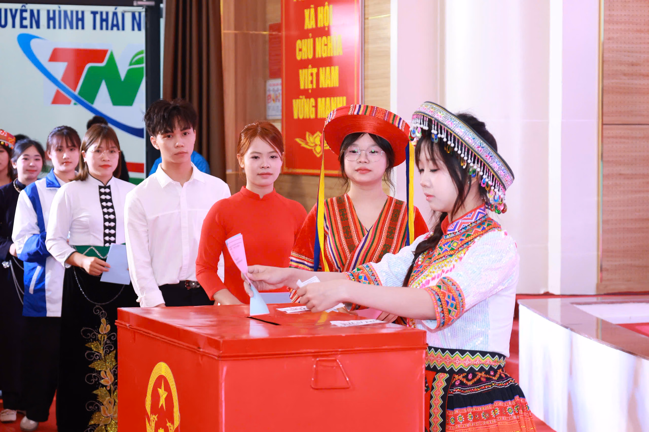Đúng 7 giờ sáng, lễ khai mạc bầu cử được tổ chức trang trọng tại hội trường Trường Đại học Khoa học - Đại học Thái Nguyên. Trong không khí nghiêm trang, các đại biểu và cử tri thực hiện nghi thức chào cờ, thể hiện tinh thần trách nhiệm và niềm tự hào khi tham gia sự kiện chính trị quan trọng của đất nước.