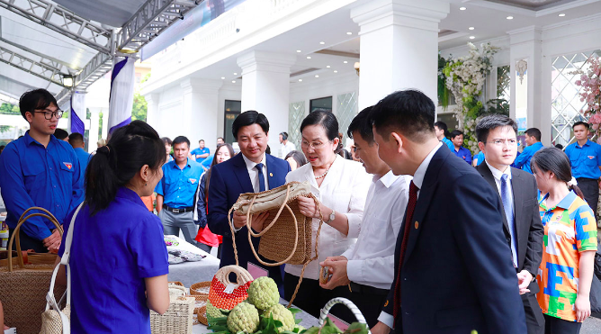Bí thư tỉnh uỷ Lê Thị Thuỷ thăm các gian hàng trưng bày sản phẩm của thanh niên. |