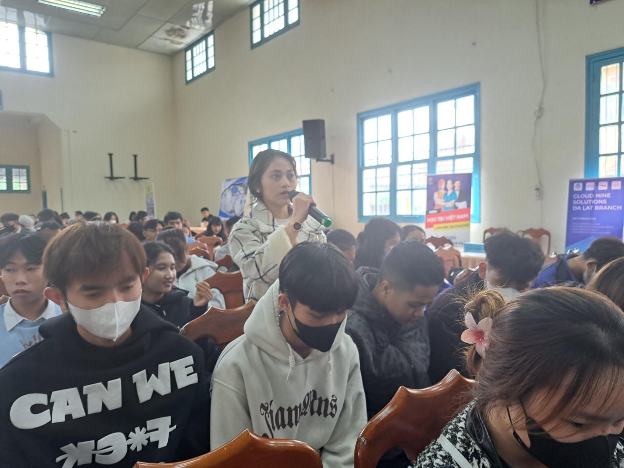 Học sinh, sinh viên nêu câu hỏi tại Ngày hội việc làm. |