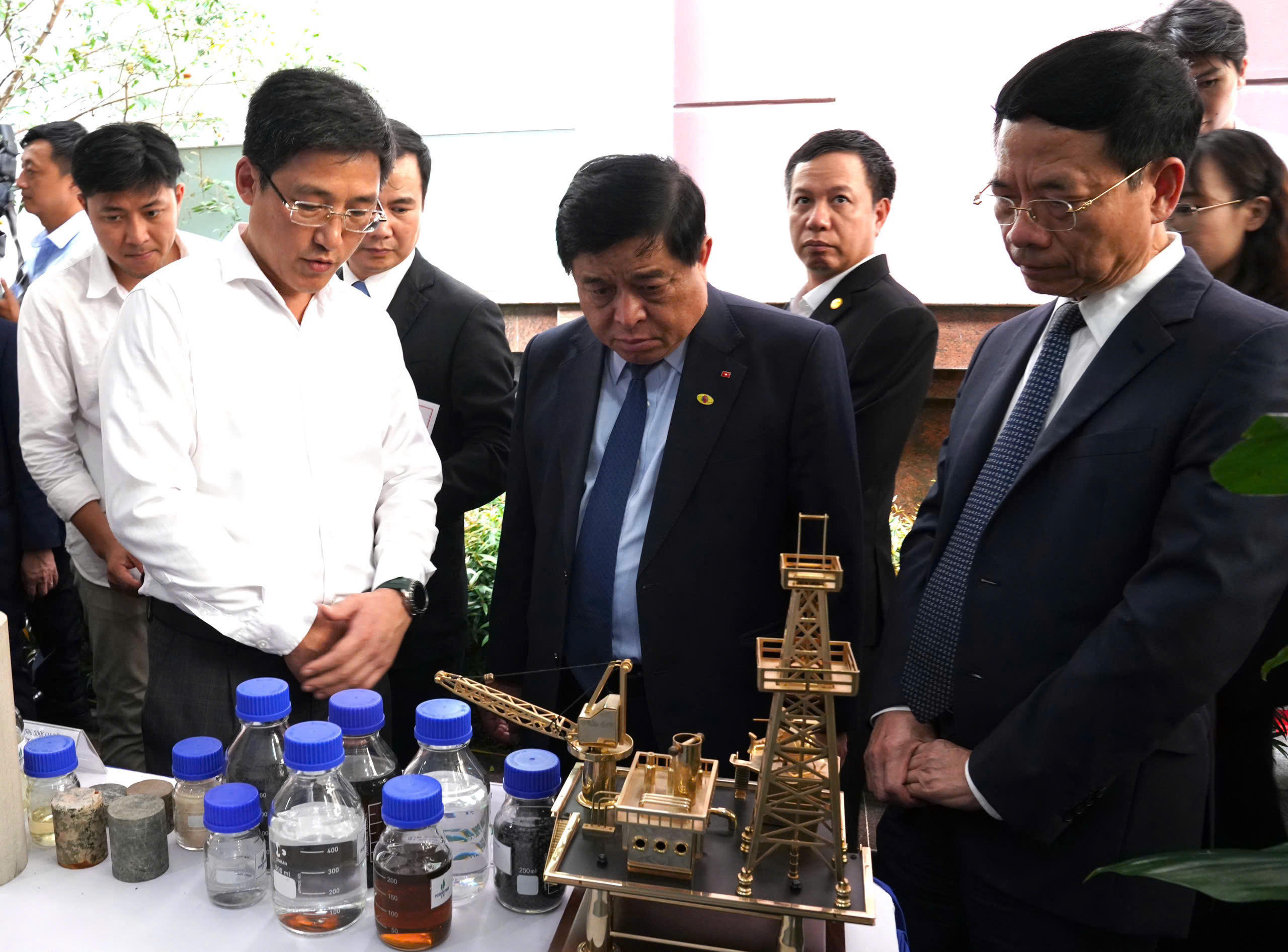 | Phó Thủ tướng Nguyễn Chí Dũng cùng Bộ trưởng Bộ KH&CN Nguyễn Mạnh Hùng tham quan và nghe giới thiệu các kết quả KH-CN, ĐMST, CĐS nổi bật (Ảnh: Bộ KH&CN) |