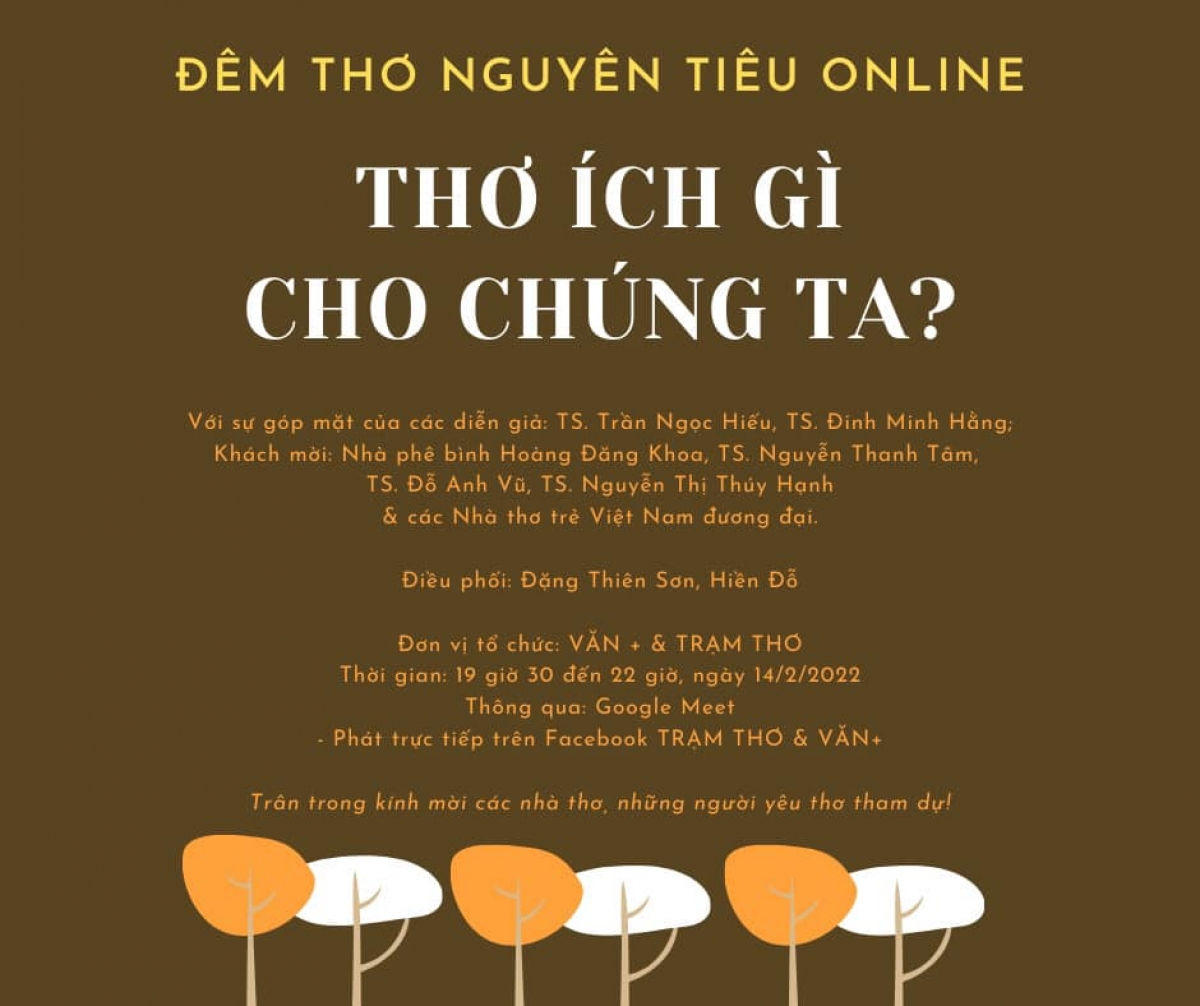 Hưởng ứng tinh thần Ngày Thơ Việt Nam, nhóm "Văn+ & Trạm thơ" đã tổ chức "Đêm thơ Nguyên tiêu online" với toạ đàm "Thơ là gì của chúng ta" có sự tham gia của gần 150 nhà thơ, diễn giả, người yêu thơ vào tối 14/2. Với 3 tiếng thảo luận sôi nổi, các nhà thơ, diễn giả, nhà phê bình đã cùng nhau đọc thơ, bàn luận về thơ trong dịp đặc biệt này.