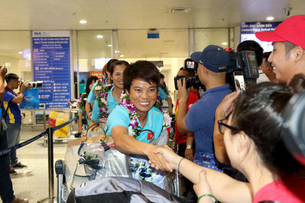 Thầy trò Đội tuyển bóng đá nữ quốc gia Việt Nam từ Thái Lan về Việt Nam chiều qua, 28/8, với nụ cười rạng rỡ trong vòng nguyệt quế tân Vô địch Đông Nam Á.