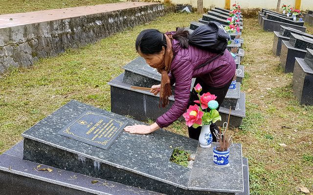 Bà Thanh bên ngôi mộ người bạn học Phương Thị Sáu ở Nghĩa trang liệt sĩ huyện Quảng Uyên.