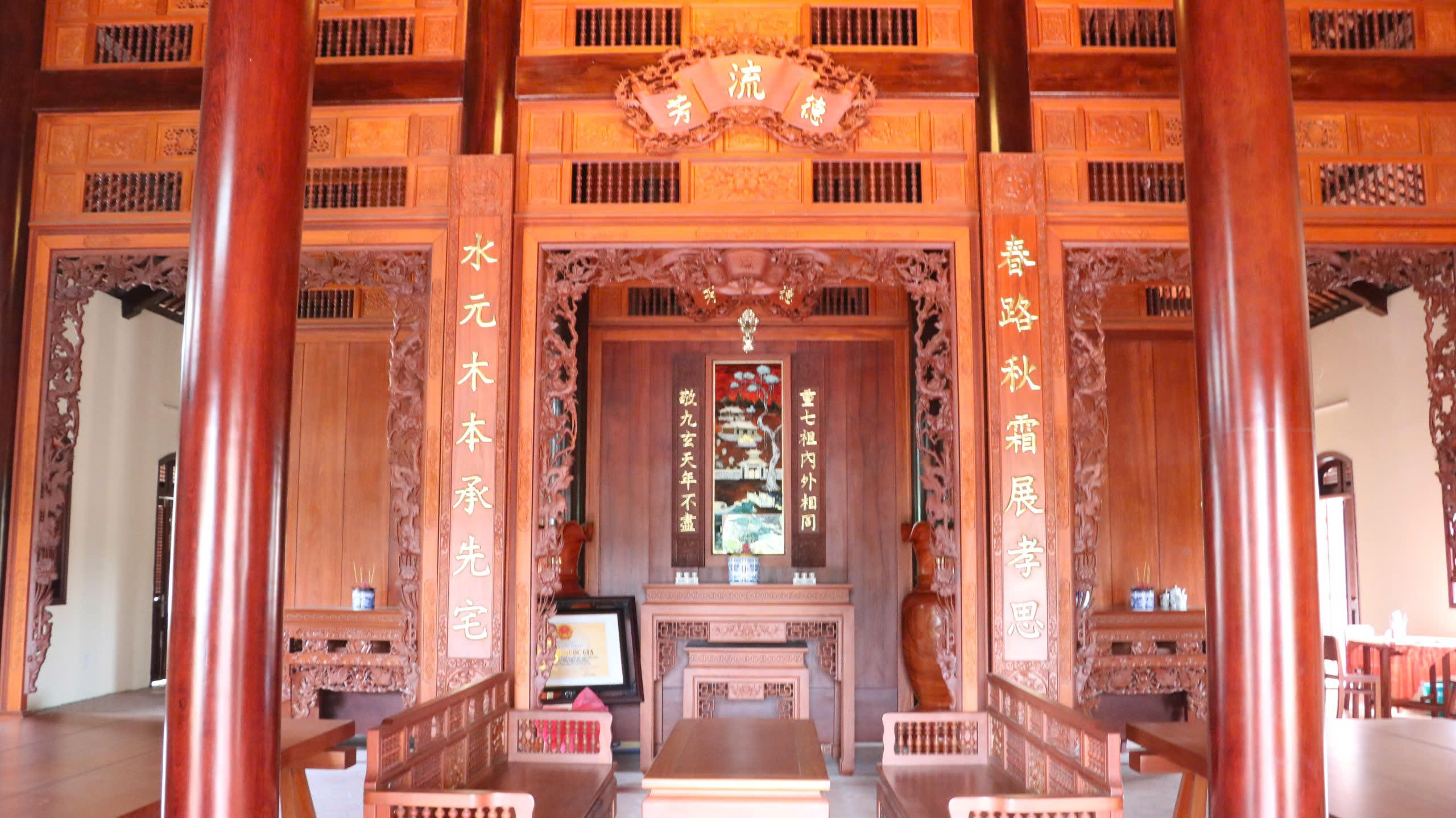 Bước vào bên trong, không gian mát mẻ, trầm mặc bao trùm lấy du khách. Trần nhà, cột kèo, và các vách ngăn đều được làm từ những loại gỗ quý. Nổi bật giữa gian chính là bàn thờ gia tiên trang nghiêm, hai bên treo những hoành phi, câu đối được chạm khắc tinh xảo, thể hiện nề nếp gia phong của chủ nhân. Sàn nhà được lát gạch tàu bóng loáng. Tất cả những chi tiết này không chỉ thể hiện sự giàu có của một gia đình điền chủ xưa mà còn là sự gìn giữ, tôn tạo kỹ lưỡng qua nhiều thế hệ.