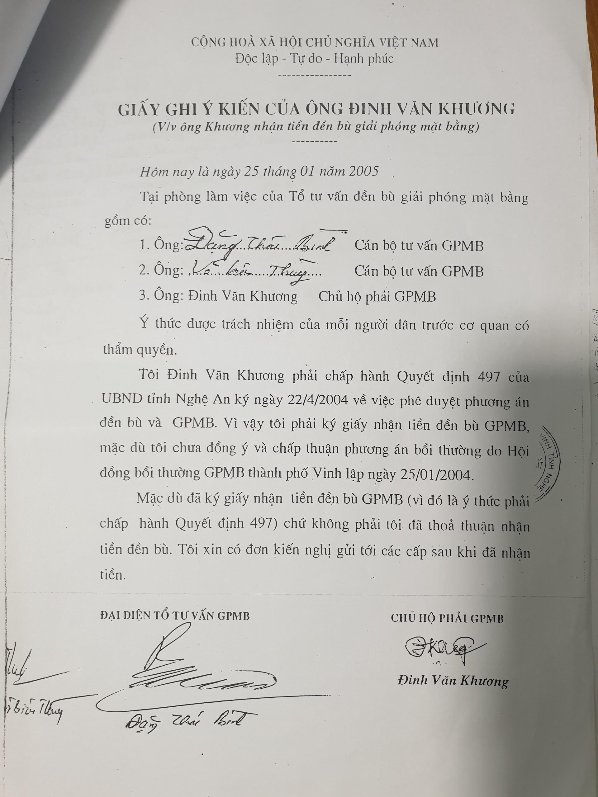 “Mặc dù chưa đồng ý chấp thuận với phương án bồi thường lập ngày 21/1/2004, nhưng do phải chấp hành Quyết định 497 của UBND tỉnh phê duyệt phương án đền bù và giải phóng mặt bằng nên tôi mới ký giấy nhận tiền. Song song với việc nhận tiền, tôi cũng ghi lại phiếu ghi nhận ý kiến về việc không chấp thuận với phương án bồi thường và được tổ tư vấn ký xác nhận”, ông Khương phản ánh.