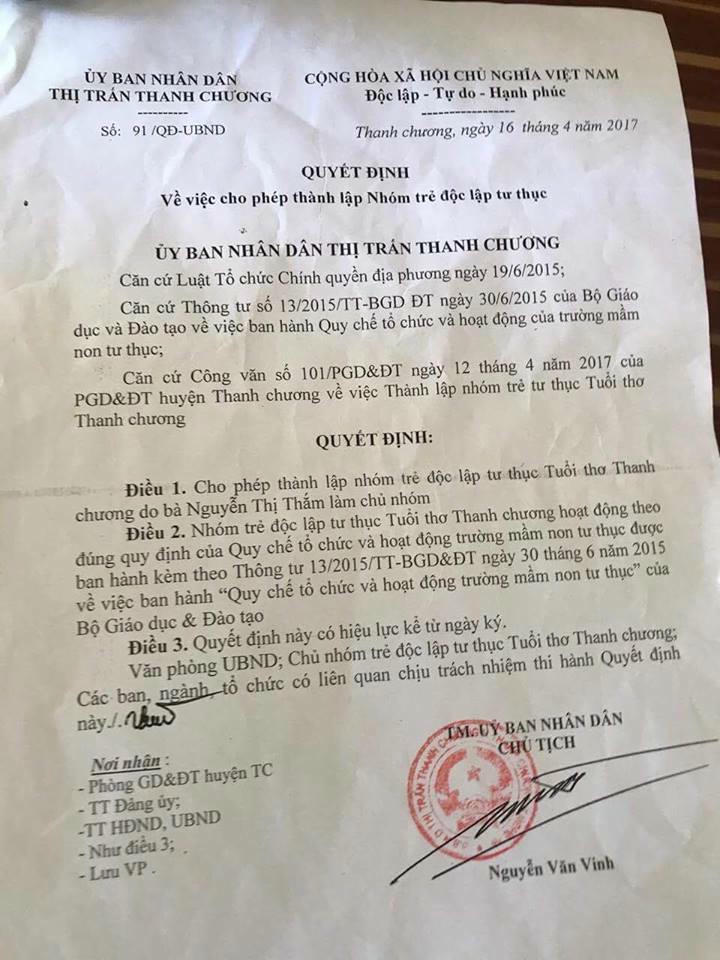 Cô Trần Thị Ba – phụ trách trường mầm non Tuổi thơ chia sẻ: “Sau khi UBND thị trấn Thanh Chương ra quyết định đình chỉ hoạt động của trường, chúng tôi đã có thông báo cáo lỗi với phụ huynh và xin được tạm dừng, nhưng hầu hết các phụ huynh vẫn đưa trẻ đến trường, chúng tôi không thể từ chối nhận các cháu. Việc tạm dừng này ảnh hưởng rất lớn tới các em học sinh và phụ huynh, cũng như các cô giáo, từ đời sống tới tinh thần. Cô và trò đang rất gắn bó yêu thương, bỗng dưng chỉ một quyết định hành chính, cánh của trường phải khép lại. Các cô giáo có qúa nhiều tâm tư nên bốt phát quỳ xuống, mong chính quyền thay đổi quyết định vì các cháu”.