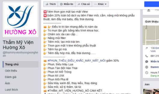 Từ quảng cáo trên trang facebook của TMV Xinh Spa (có trụ sở trên đường Trần Phú, TP Vinh, Nghệ An), phóng viên liên hệ qua điện thoại thì được 1 nhân viên tên Phương cho biết: nếu cắt mí mắt sẽ có giá 8 triệu đồng, nhấn mí mắt thì 5 triệu đồng, đồng thời cam đoan “bảo hành trọn đời”.