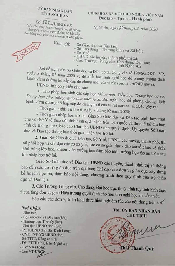 (PLVN) - Chủ tịch UBND tỉnh Nghệ An Thái Thanh Quý vừa ký văn bản Hỏa tốc quyết định cho học sinh các cấp trên địa bàn toàn tỉnh nghỉ học để phòng chống dịch bệnh viêm đường hô hấp cấp do chủng mới của virus corona gây ra.