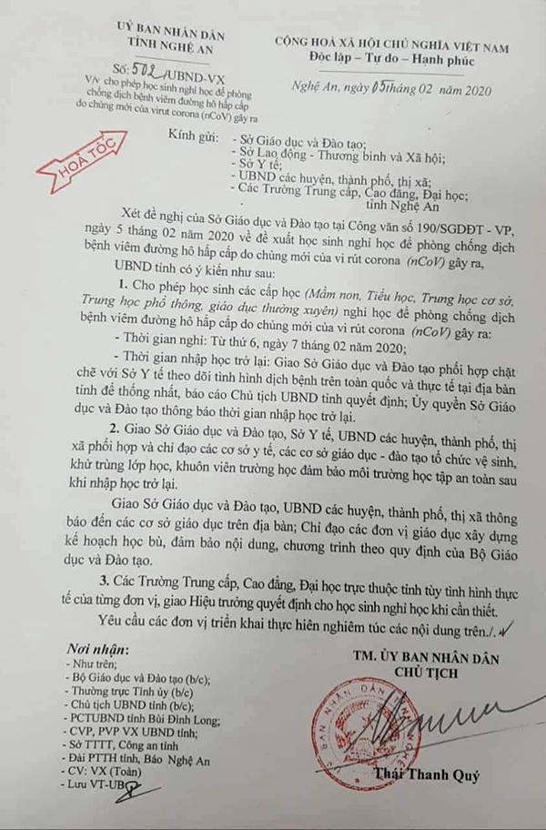 Trước đó, cùng ngày (5/2/2020) Sở Giáo dục và Đào tạo Nghệ An có công văn số 190 đề xuất cho học sinh nghỉ học để phòng chống dịch bệnh viêm đường hô hấp cấp do chủng mới của virus corona gây ra.