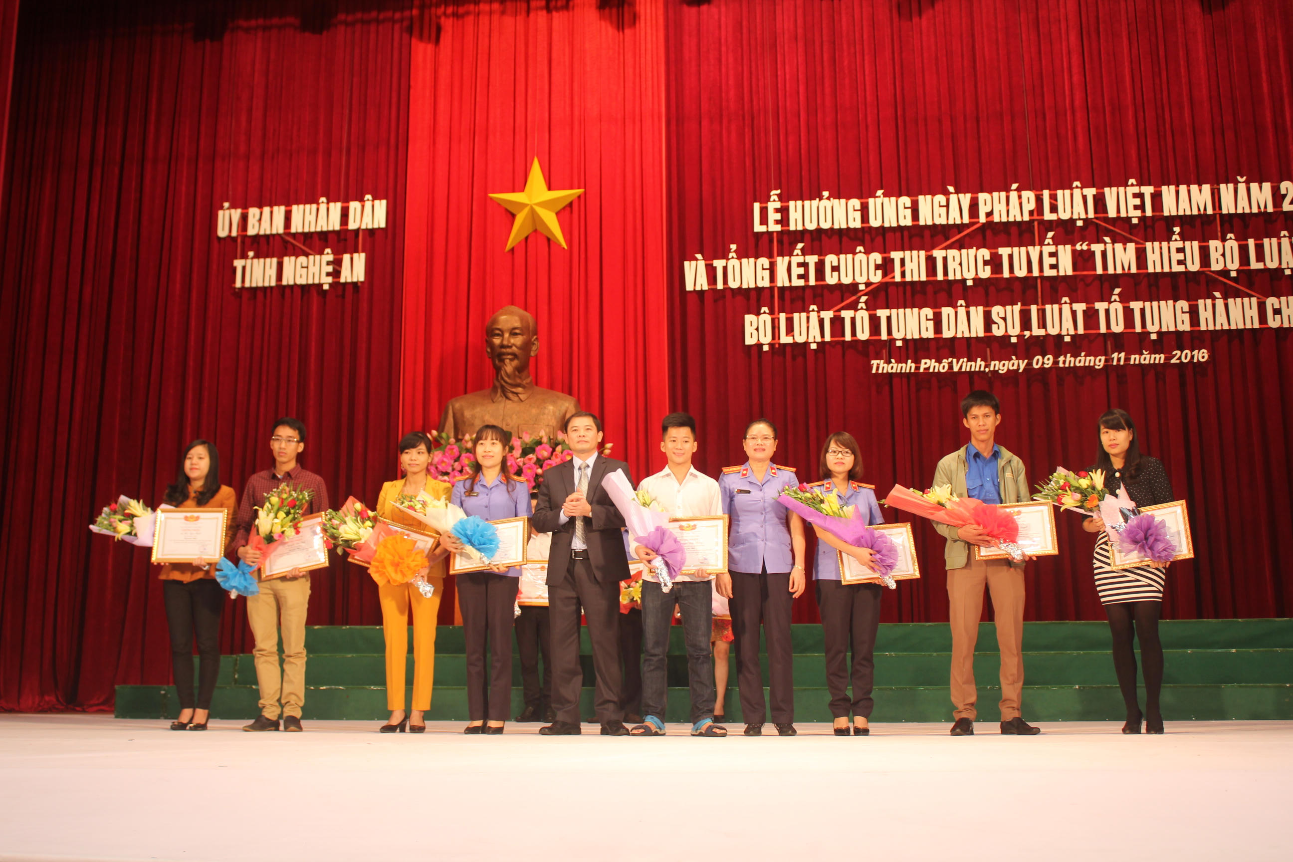 (PLO) - Sáng 9/11, UBND tỉnh Nghệ An tổ chức Lễ hưởng ứng ngày Pháp luật Việt Nam năm 2016 và Tổng kết Cuộc thi trực tuyến Tìm hiểu Bộ luật Dân sự, Bộ luật Tố tụng dân sự, Luật tố tụng hành chính.