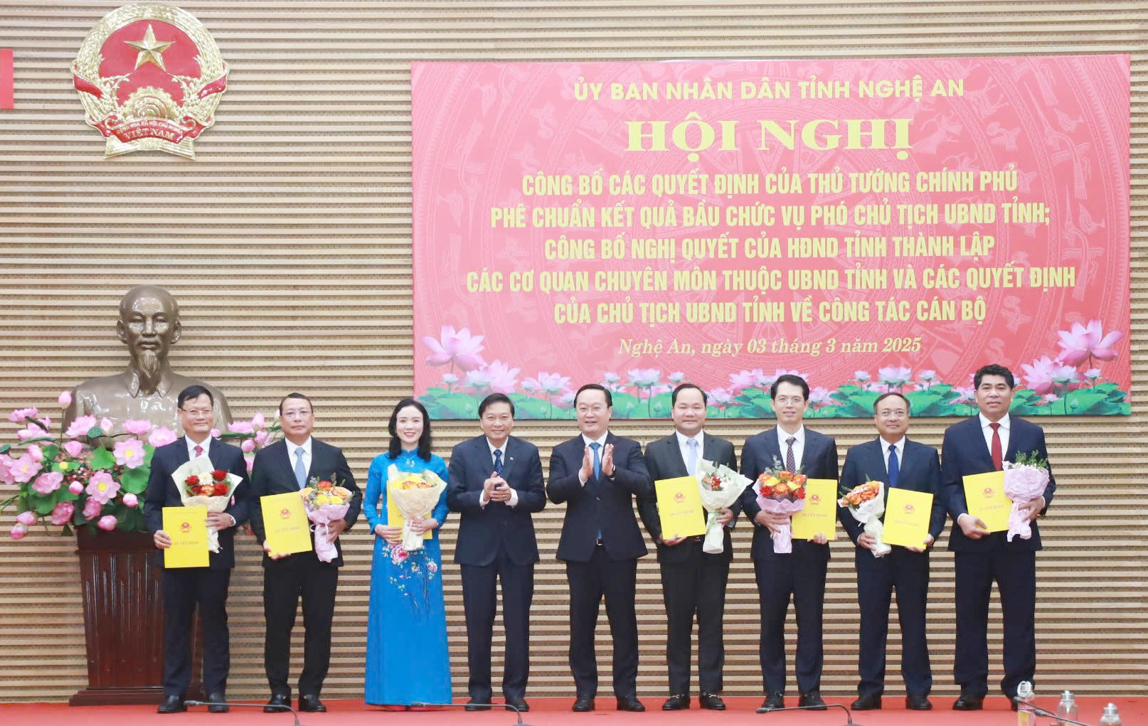 (PLVN) - Sáng 3/3, UBND tỉnh Nghệ An tổ chức lễ công bố các quyết định của Thủ tướng Chính phủ về việc phê chuẩn hai Phó chủ tịch UBND tỉnh. Đồng thời, công bố các quyết định của Chủ tịch UBND tỉnh về việc điều động, bổ nhiệm giám đốc, phó giám đốc các sở, ngành sau sắp xếp, hợp nhất.