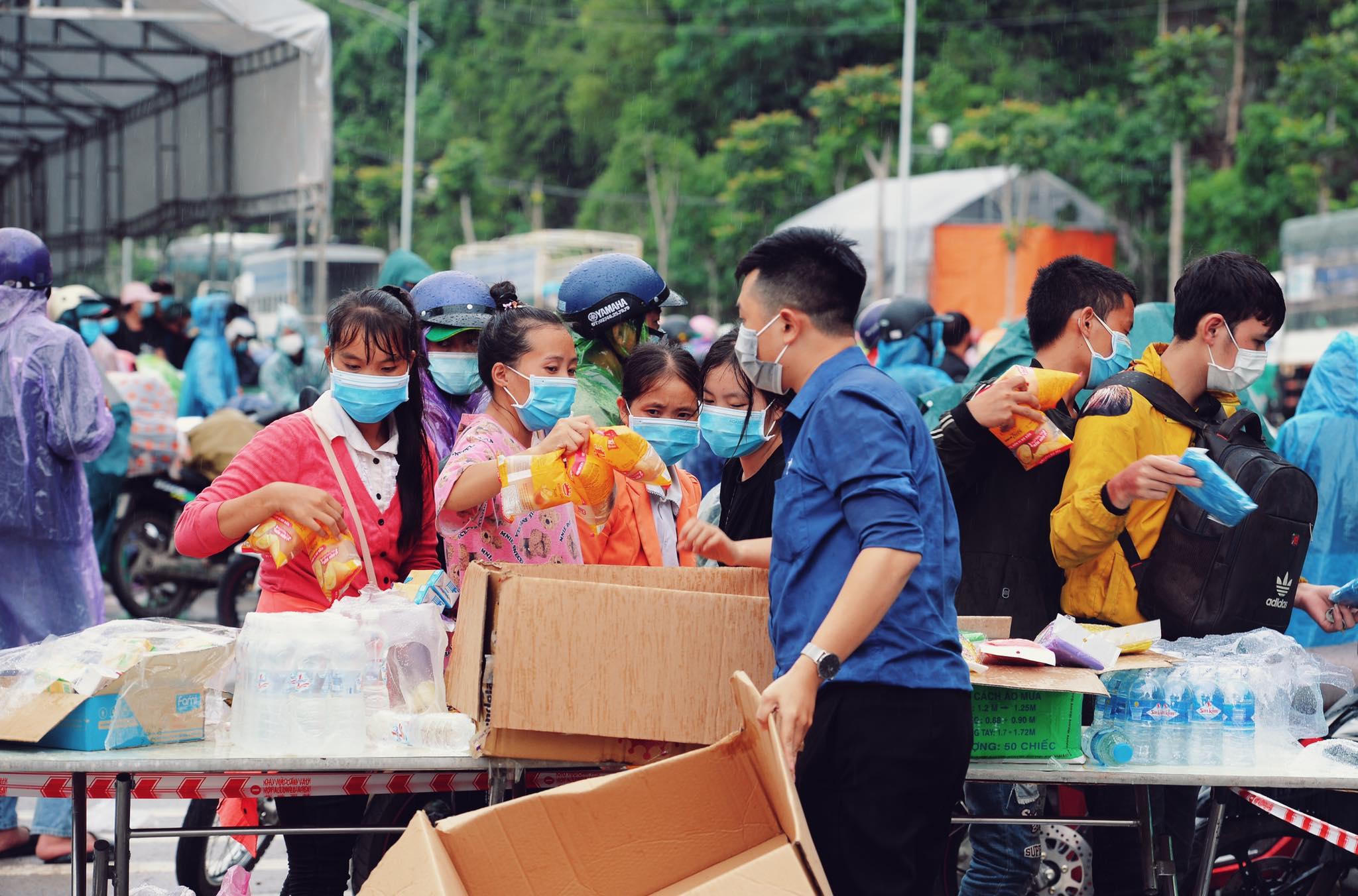 Công dân từ các tỉnh phía nam về quê tránh dịch khi đi qua Nghệ An được chính quyền và nhiều đoàn thiện nguyện hỗ trợ. |