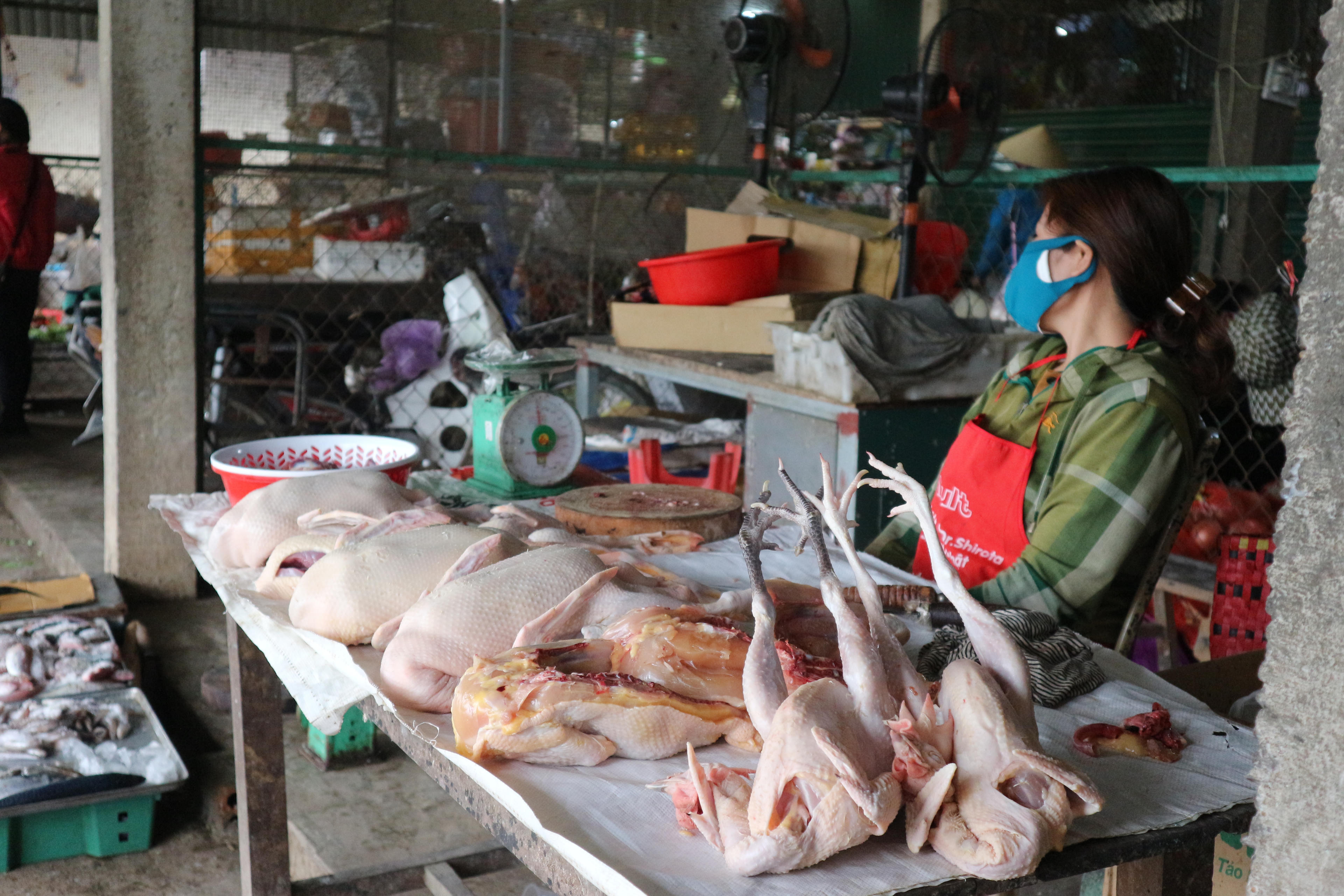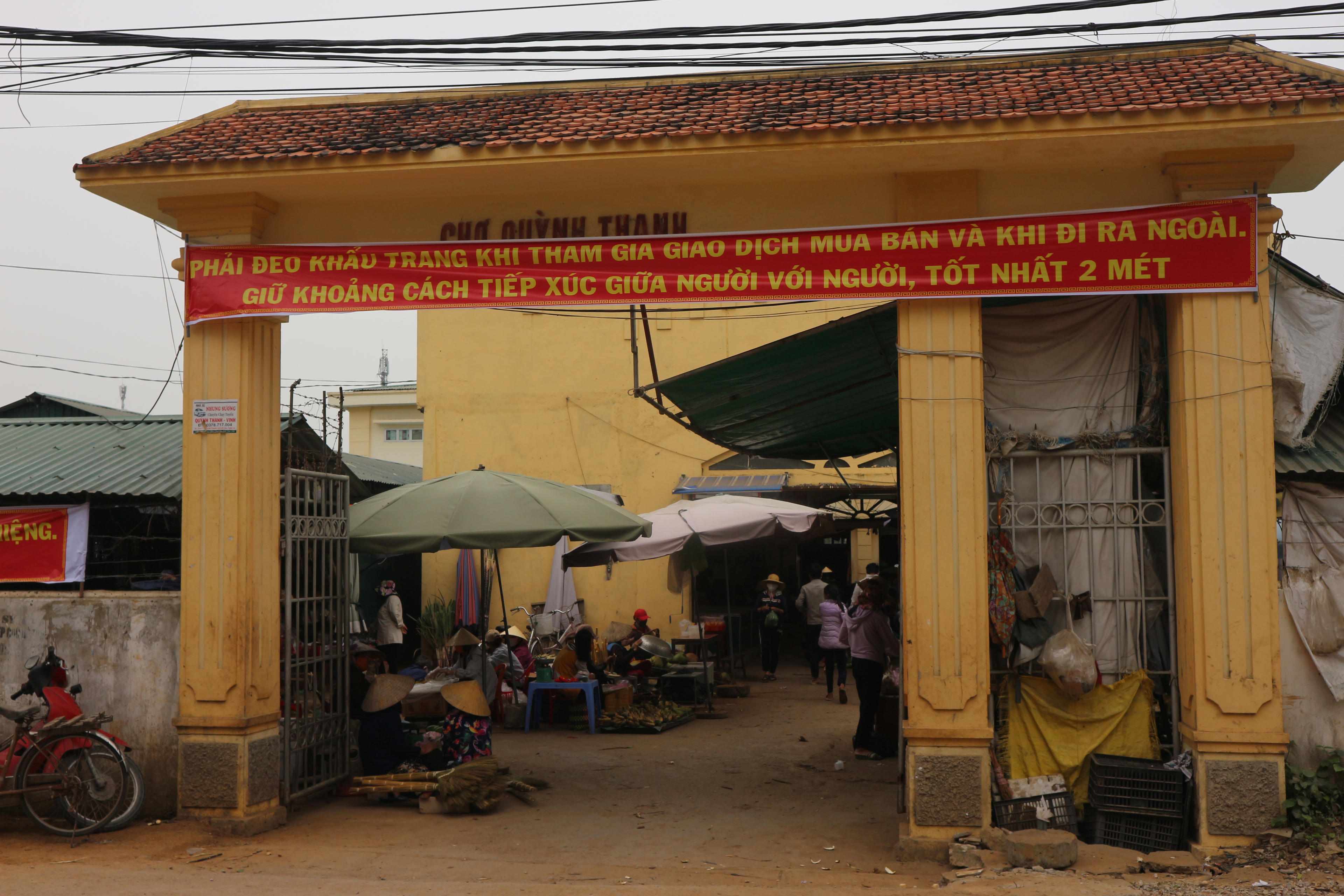 Ngay trước cổng chợ xã Quỳnh Thanh (huyện Quỳnh Lưu) chính quyền đã treo băng rôn với nội dung: “Phải đeo khẩu trang khi tham gia giao dịch mua bán và khi đi ra ngoài, giữ khoảng cách tiếp xúc giữa người với người tốt nhất 2m”. Trong chợ, các gian hàng bán cá, thịt, rau vẫn hoạt động bình thường để phục vụ nhu cầu của người dân.