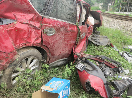 Bất ngờ lúc này. tàu hỏa mang số hiệu SE8 đang lưu thông theo hướng Nam – Bắc lao đến tông thẳng. Cú va chạm kinh hoàng khiến chiếc xe bị hất văng sang bên đường, chiếc ô tô bị hư hỏng rất nặng, toàn bộ phần khung xe bị biến dạng.