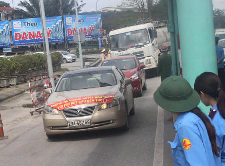 Khoảng 9h gần 50 chiếc xe ô tô của người dân thành phố Vinh và Hà Tĩnh diễu hành bắt đầu từ Nghi Xuân sang đến phường Bến Thuỷ (TP.Vinh), trên xe dán băng rôn, khẩu hiệu với nội dung: Thu phí BOT qua cầu Bến Thuỷ I là trái với Pháp lệnh - Pháp luật Việt Nam; Chúng tôi cương quyết đấu tranh với phí BOT cầu Bến Thuỷ; Đấu tranh vì công lý chống lợi ích nhóm... Đoàn xe tập trung khi đi qua cầu Bến Thuỷ gây lộn xộn, tắc đường, hàng chục cảnh sát có mặt để phân luồng giao thông.