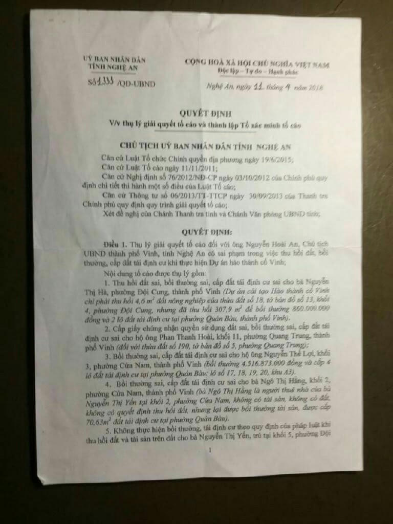 | Chủ tịch UBND tỉnh Nghệ An Nguyễn Xuân Đường đã ra Quyết định số 1333 QĐ- UBND vào ngày 11/4/2018, thụ lý tố cáo đối với ông Nguyễn Hoài An, Chủ tịch UBND Tp Vinh. |