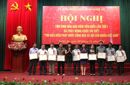 (PLO) - Sáng ngày 7/11, ông Lê Xuân Đại – Phó chủ tịch UBND tỉnh Nghệ An chủ trì Hội nghị tôn vinh hoà giải viên tiêu biểu lần thứ nhất và phát động cuộc thi viết “tìm hiểu Hiến pháp nước cộng hòa xã hội chủ nghĩa Việt Nam”. Buổi lễ có sự tham gia của 210 hòa giải viên đến từ các địa phương trong tỉnh.