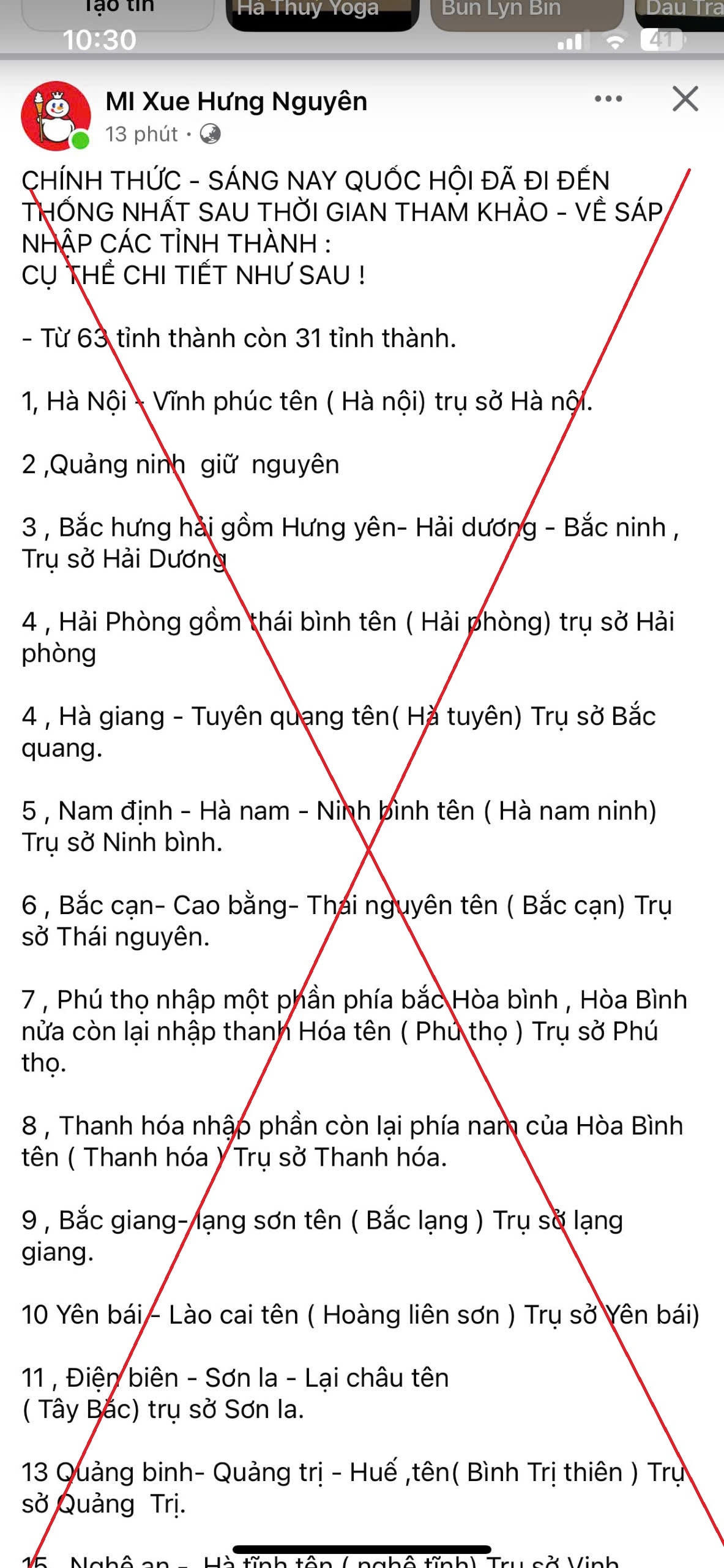 Cụ thể, ngày 25/2/2025 một tài khoản facebook có tên “MI Xue Hưng Nguyên” đăng tải bài viết với nội dung “CHÍNH THỨC - SÁNG NAY QUỐC HỘI ĐÃ ĐI ĐẾN THỐNG NHẤT SAU THỜI GIAN THAM KHẢO - VỀ SÁP NHẬP CÁC TỈNH THÀNH: CỤ THỂ NHƯ SAU! Từ 63 tỉnh thành còn 31 tỉnh thành...”.
