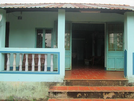 Theo chỉ dẫn của một người dân, tôi tìm đến nhà cụ Bò. Ngôi nhà nhỏ nằm lặng yên bên con đường nhỏ dẫn ra cửa khẩu biên giới Hoàng Diệu với xung quanh là cây cối xum xuê. Một không gian rất trong lành và bình dị. Tôi đến vào giờ nghỉ trưa, đúng lúc cụ Bò đang dùng bữa.