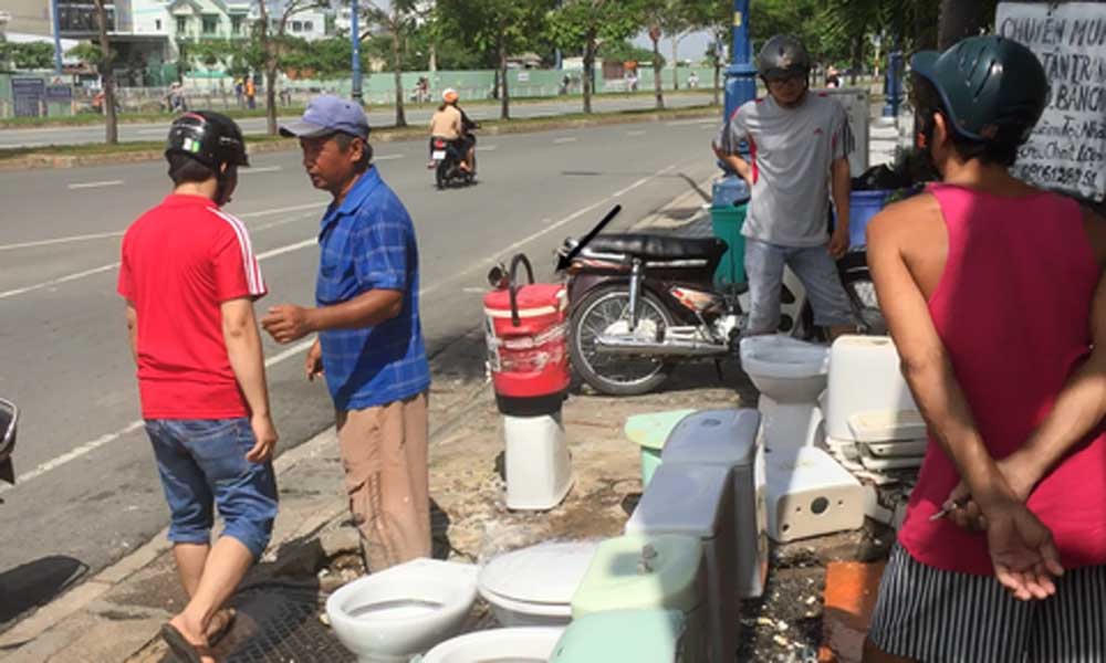 Trời nắng gắt, sát lề đường Võ Văn Kiệt (phường 6, quận 5, TP.HCM), một người đàn ông trung niên đang chùi rửa chiếc bồn cầu cáu bẩn. Phía trước mặt ông, hàng chục chiếc bồn cầu khác mới tinh xếp thành hàng ngay ngắn...