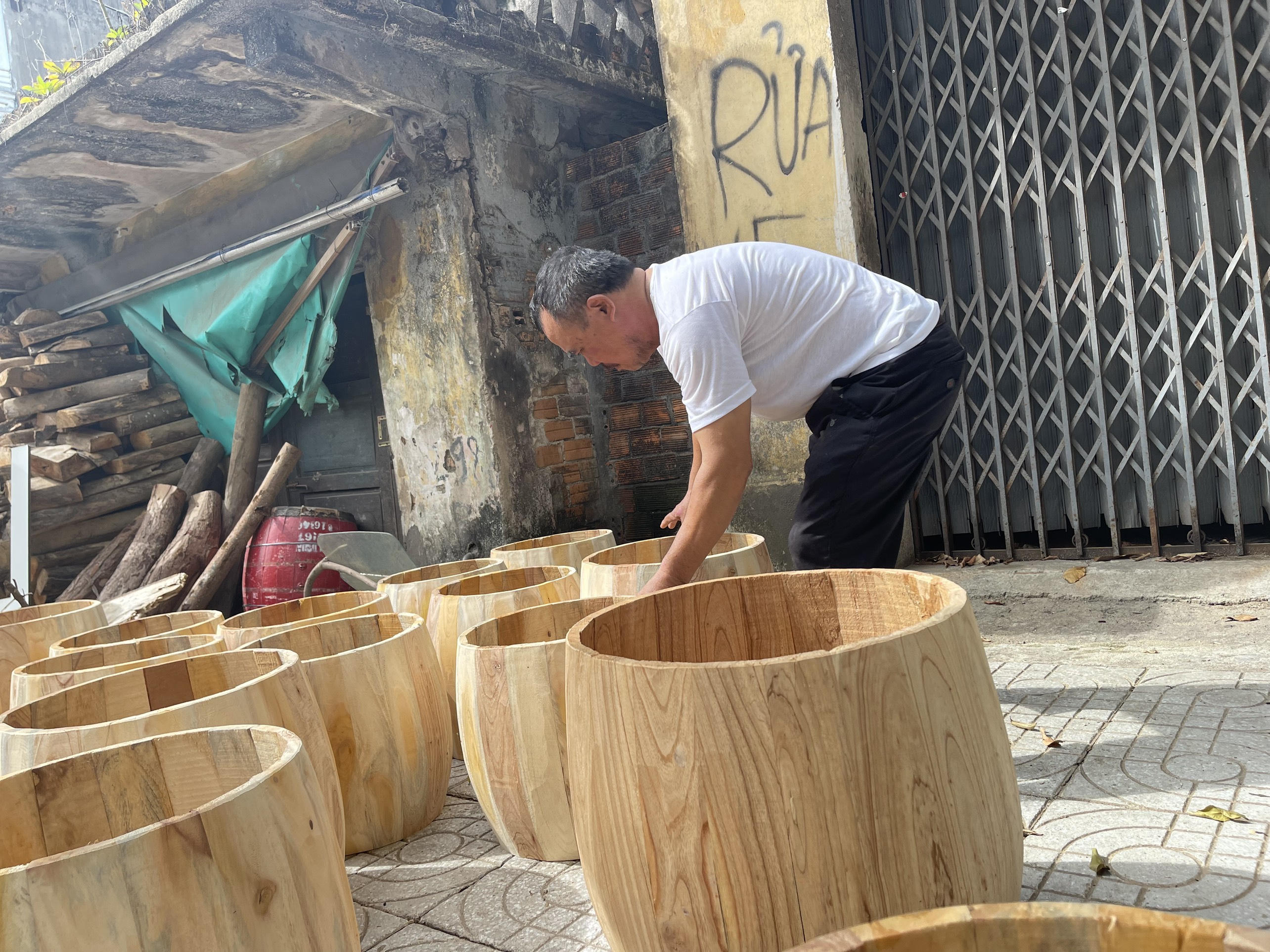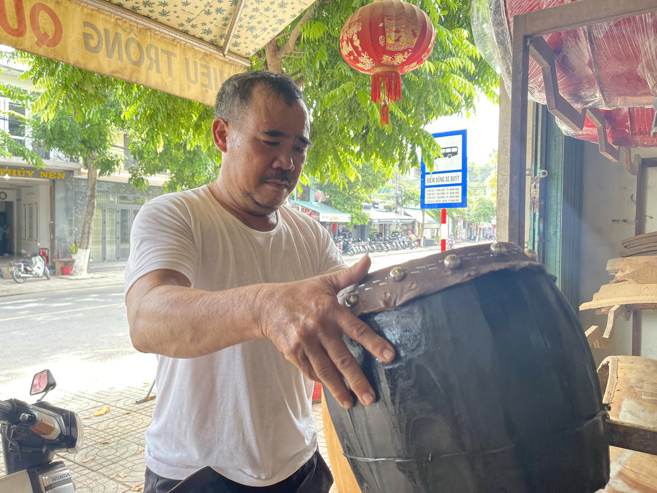 Ông Lê Thế Khánh (57 tuổi, xã Tiên Sơn, thị xã Duy Tiên, tỉnh Hà Nam) vào Quảng Ngãi để giúp gia đình ông Thắng làm trống trong dịp Tết Trung thu. |