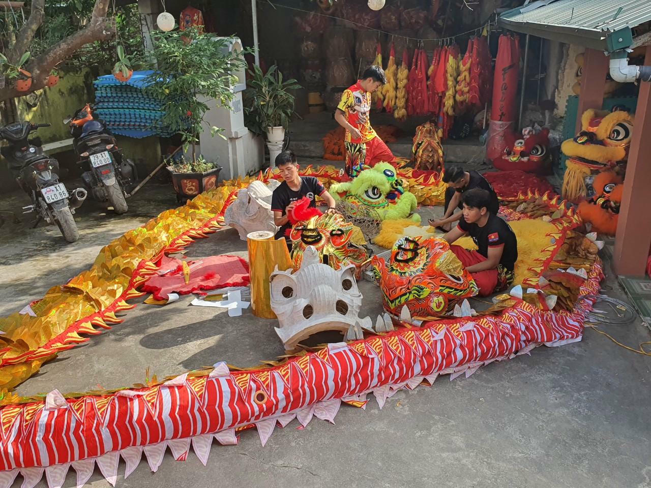 Theo anh Bùi Viết Tưởng, để sản xuất ra một đầu lân hay đầu rồng phải trải qua rất nhiều công đoạn. Từ làm khung - công đoạn khó nhất, đến cắt, may, làm phụ kiện trang trí… tất cả đều đòi hỏi sự khéo léo, tỉ mỉ đến từng chi tiết. Mỗi khi làm một con lân, anh Tưởng đều đặc biệt chú trọng đến khâu chuẩn bị vật liệu. Từ thanh mây, thanh nứa, đến loại giấy, vải, lông cừu trang trí được chính tay anh tuyển lựa. Đặc biệt là phần phối màu sắc, đòi hỏi người nghệ nhân phải có mắt thẩm mỹ tinh tế, làm sao màu vừa có độ trang nhã, vừa có sự đậm nhạt đúng nơi, đúng chỗ, lại vừa bắt mắt thu hút người mua, người xem.