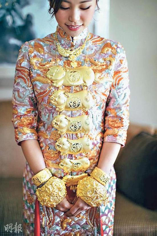 Con dâu của Tiết Gia Yến tên Trần Tố Di (Zoe), được mẹ chồng tặng cho rất nhiều vàng trong ngày lên xe hoa. Ngoài chiếc vòng 6 con lợn, Gia Yến tặng con dâu một số vòng vàng Long Phụng đeo tay. Trong bức ảnh được chia sẻ trên mạng xã hội, Zoe mặc trang phục truyền thống, cổ và người trĩu vàng.