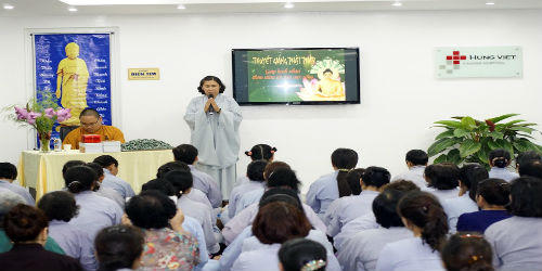 (PLO) - Mới đây, nghệ sĩ Hán Văn Tình đã tham gia buổi giảng pháp của Đại Đức Thích Nguyên Đạo cùng phật tử trong đạo tràng Hàng Bài và đạo tràng Văn Chương tại bệnh viện Ung bướu Hưng Việt