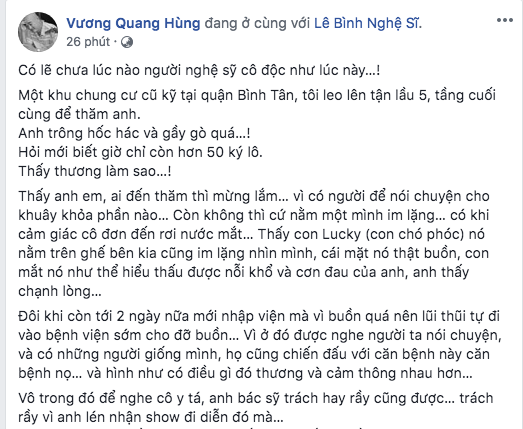 "Tám tháng rồi, anh vừa chống cự vừa làm quen với căn bệnh ác tính. Ngày ngày phải uống thuốc giảm đau, đôi khi phải chấp nhận uống morphine vì nếu không thì có cắn răng cũng không chịu thấu. Rồi phải cộng thêm 6 lít nước vì cơ thể anh rất nóng bởi phương cách xạ trị của y khoa. Tám tháng rồi, xa bạn xa bè, xa... ly bia, điếu thuốc, xa những cuộc họp mặt thân tình rôm rã, xa nghiệp xa nghề, xa sân khấu, xa phim trường. Anh vật vã trong sự chịu đựng một mình, một mình nói, một mình nghe, một mình nghĩ suy, rồi một mình ngậm ngùi… Có lẽ chưa lúc nào người nghệ sĩ cô độc như lúc này…" - nghệ sĩ Lê Bình ngậm ngùi.