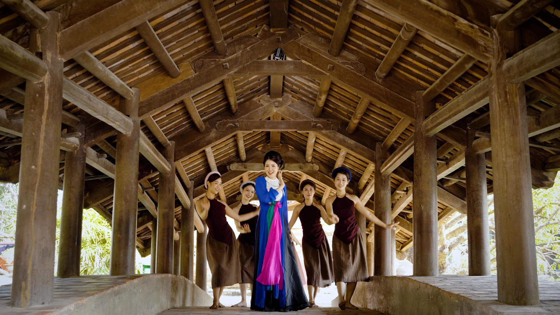 | Nghệ sĩ trẻ Thanh Huyền (giữa) trong video âm nhạc “Yếm đào chơi xuân”. |