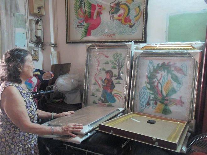 Trong căn phòng chật hẹp nhưng chứa đầy đồ đạc, vật dụng thêu tranh, bà Viện đang lúi húi dọn dẹp mấy bức tranh vừa thêu xong cho ngăn nắp. Hai bên tường, những bức tranh thụt nổi đủ các hoa văn, màu sắc được đóng khung treo cẩn thận. Bà cho biết đó là những bức tranh bà thêu thời trẻ, đến nay đã mấy chục năm.