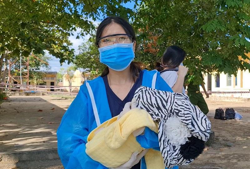 Cách đó không xa, chị Nguyễn Thị Mỹ Hoa (huyện Nghĩa Hành, tỉnh Quảng Ngã) bận rộn với 2 đứa con, đứa nhỏ 1 tuổi đang địu trước ngực, đứa lớn 4 tuổi chạy loanh quanh. Hành lý đã được lực lượng tại khu cách ly hỗ trợ mang vào.