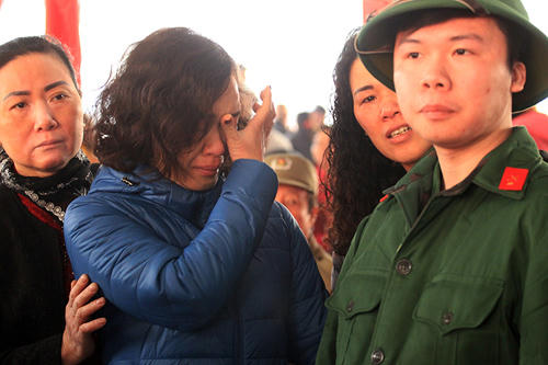 Chị Lưu Thiên Phượng không cầm được nước mắt khi phải chia tay con trai mình là tân binh Đỗ Như Quý trong buổi lễ giao nhận quân sáng nay. Nguồn: Dân Việt