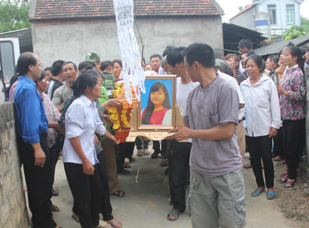 (PLO) - Sáng nay, 4/7, gia đình người thân, bạn bè tiến hành làm lễ mai táng, đưa thi thể nữ sinh Phan Thị Hải (trú tại xã Hội Sơn, Anh Sơn, Nghệ An), một trong ba sinh viên tình nguyện mới bị đuối nước về nơi an nghỉ cuối cùng. Trong đó đoàn dài tiễn đưa em, có nhiều người mang màu áo xanh tình nguyện...