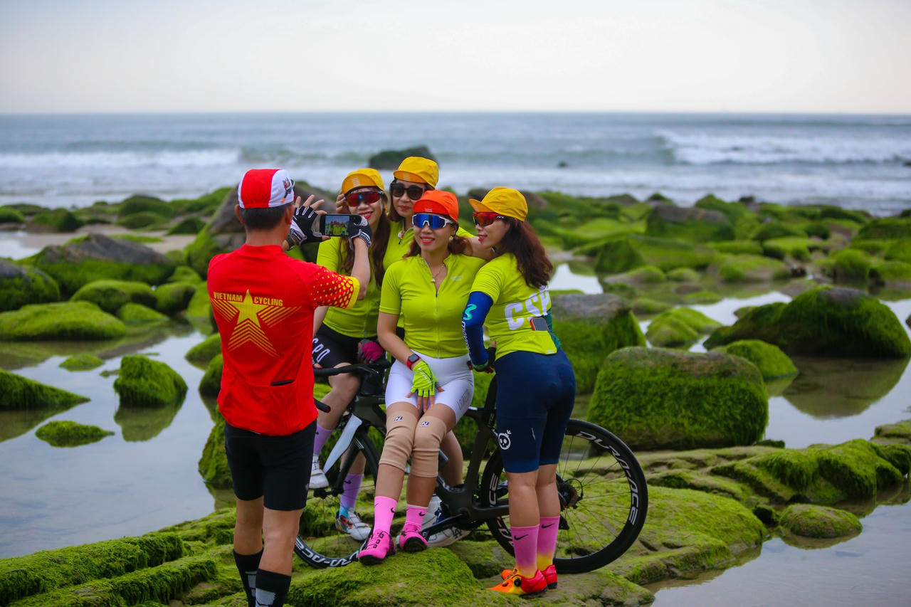 Một nhóm bike tranh thủ check in tại bãi rêu Nam Ô trong lúc đạp xe tập thể dục lúc sáng sớm.