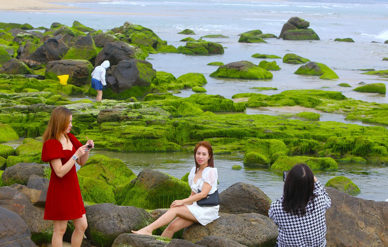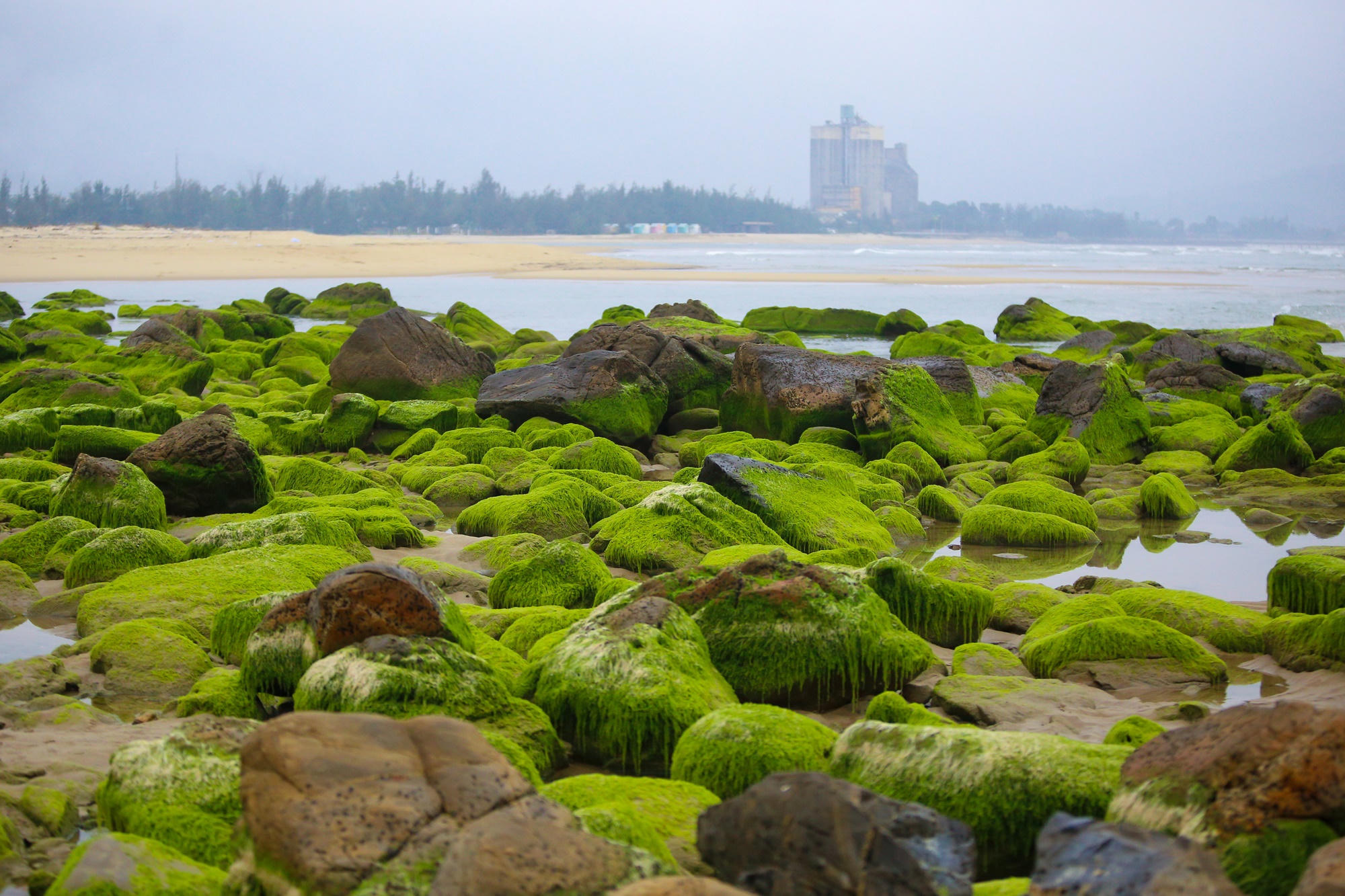 Các tảng đá dưới nước được phủ bởi lớp rêu xanh. Khi thủy triều xuống, lớp rêu lộ ra xanh mướt, rất đẹp.