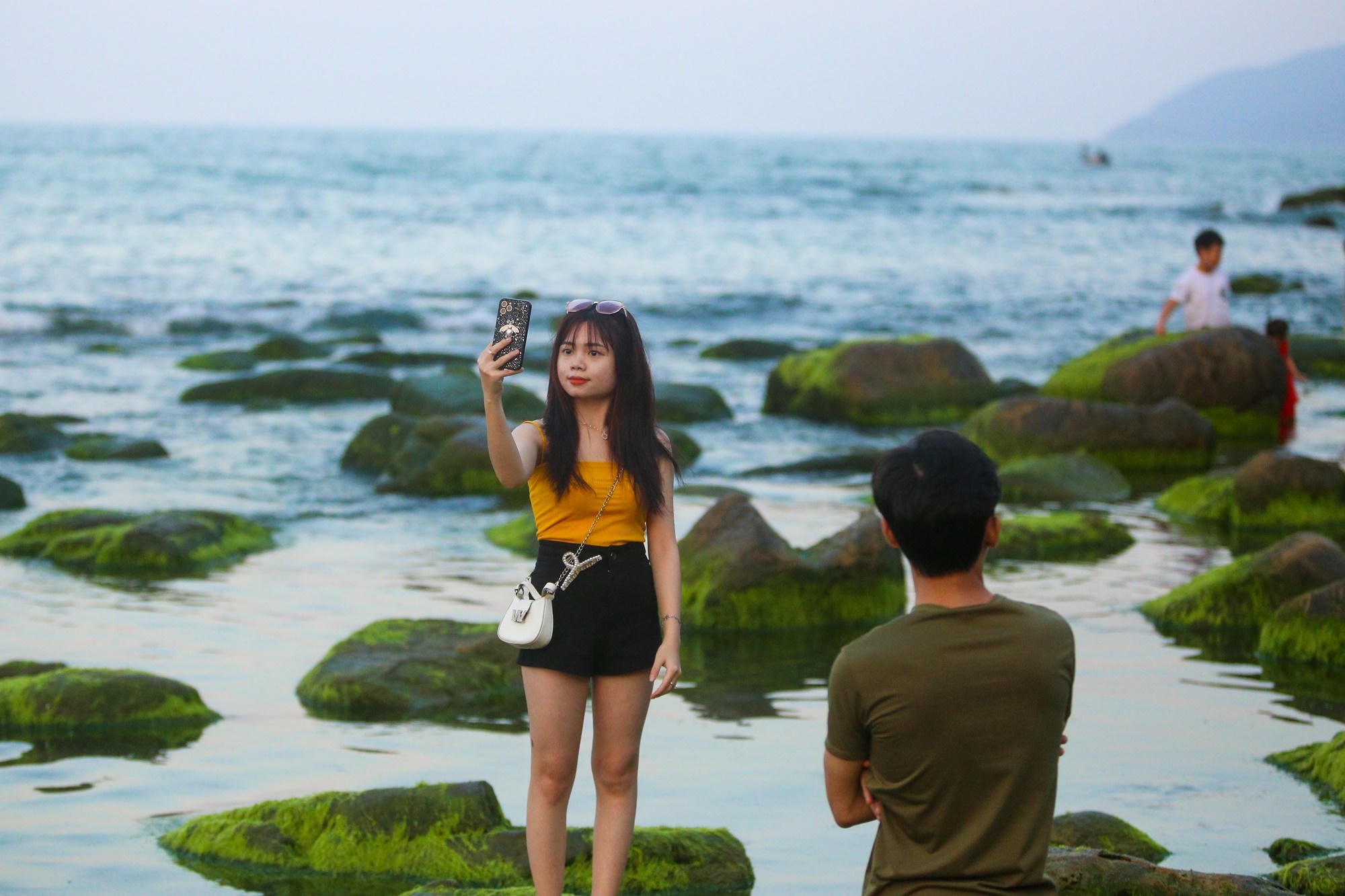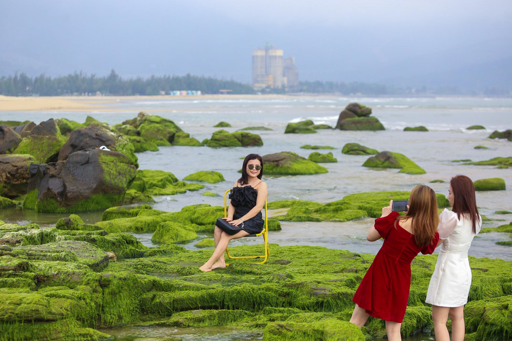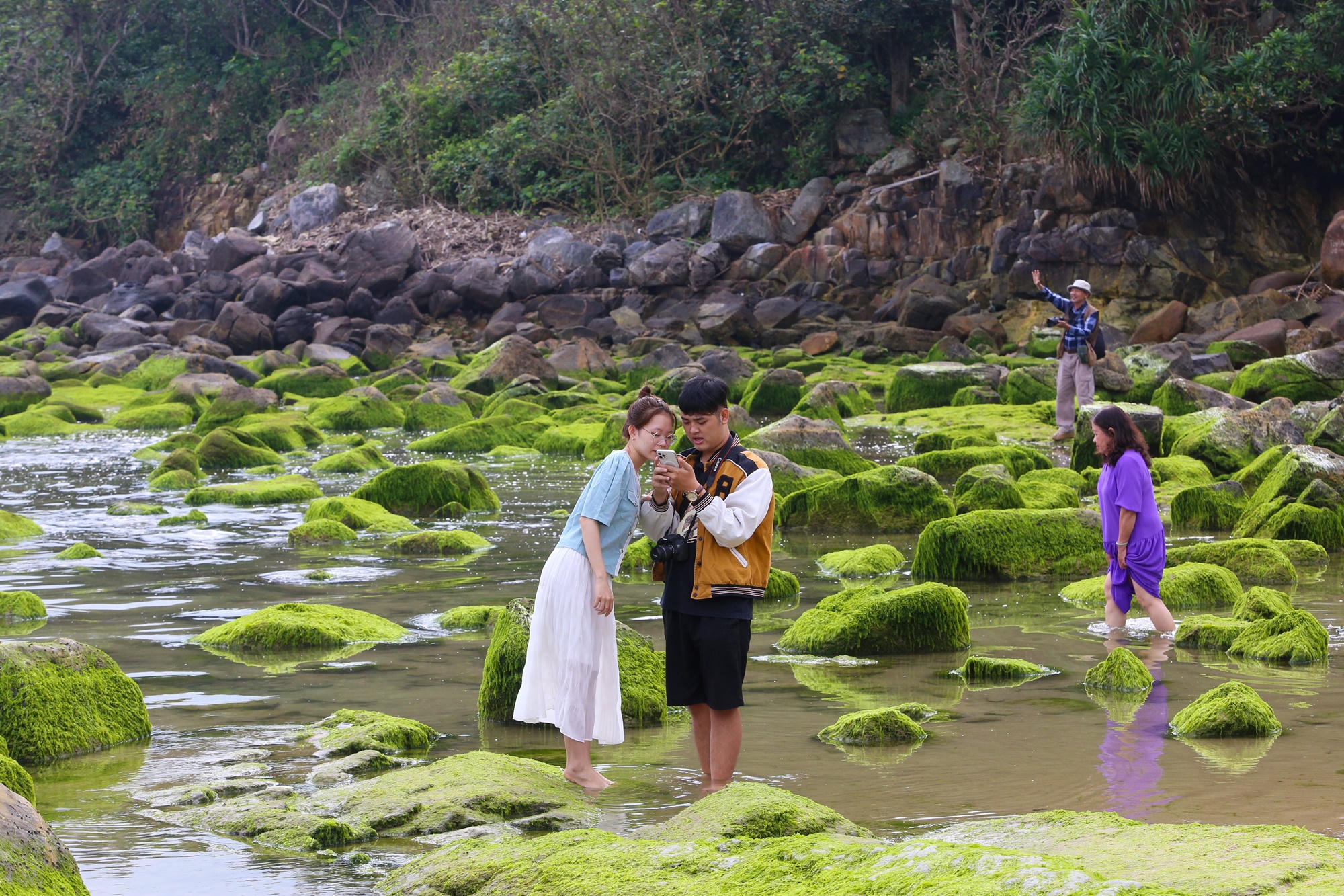 Nhóm du khách thích thú "check-in" mùa rêu xanh tại rạn Nam Ô.
