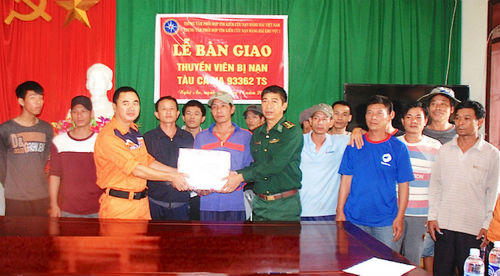 | Trung tâm phối hợp tìm kiếm, cứu nạn hàng hải khu vực 1 bàn giao các thuyền viên gặp nạn cho Đồn Biên phòng Quỳnh Thuận |
