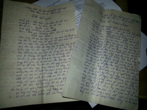 | Lá đơn do hung thủ Nguyễn Văn Tân viết từ năm 1995 được anh Hùng giữ lại, quyết tìm đường kêu oan cho mình |