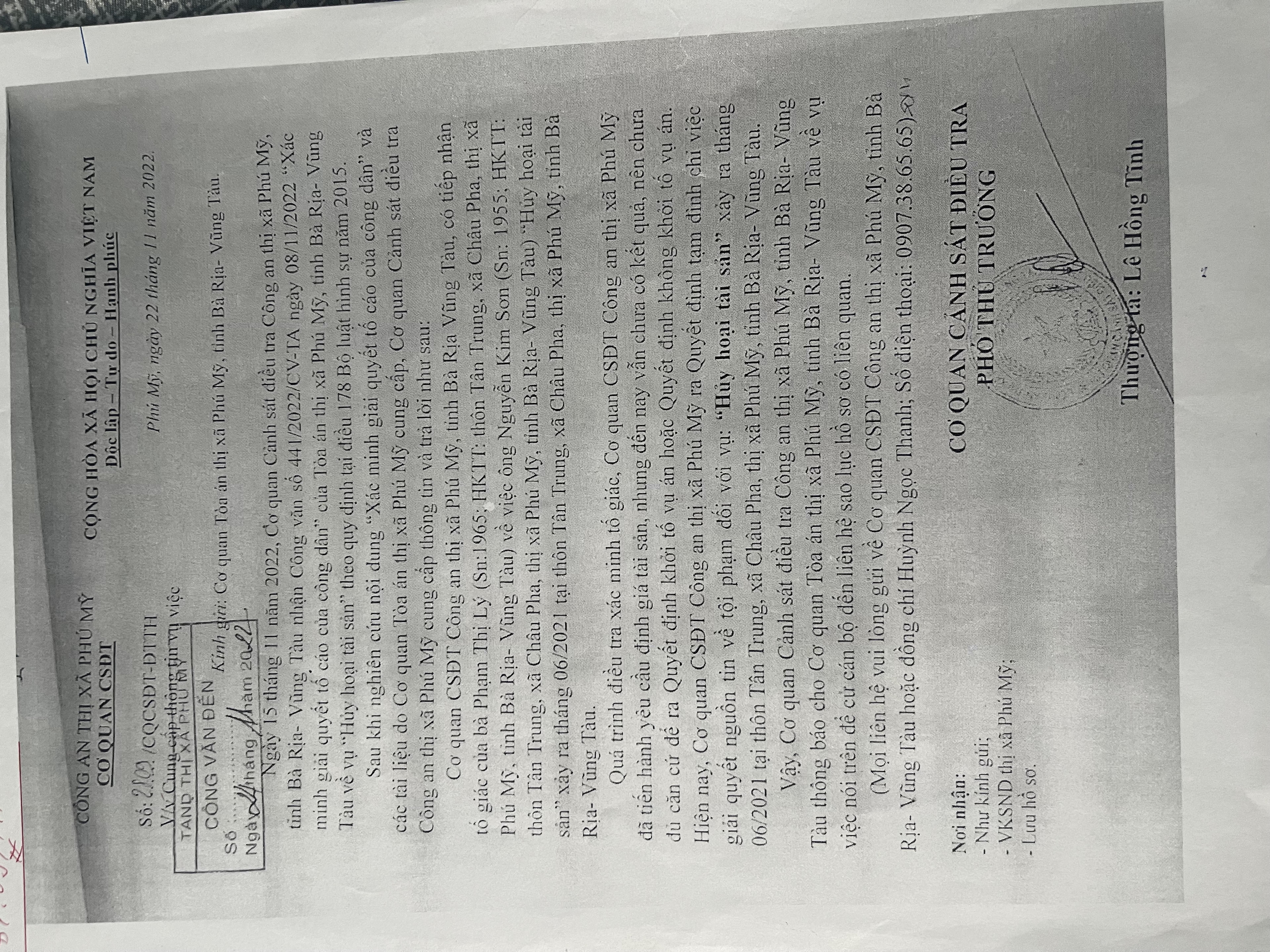 (PLVN) - Cơ quan CSĐT - Công an TX Phú Mỹ (tỉnh Bà Rịa - Vũng Tàu) mới đây đã tạm đình chỉ giải quyết một vụ giải quyết tin tố giác tội phạm “Hủy hoại tài sản” do chờ kết quả giám định tài sản bị thiệt hại.
